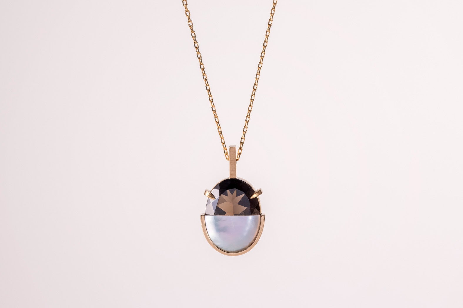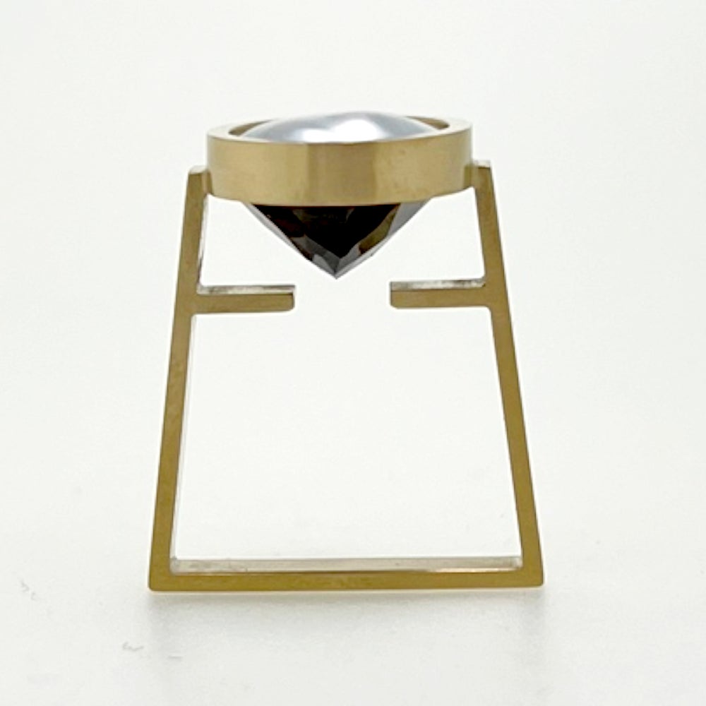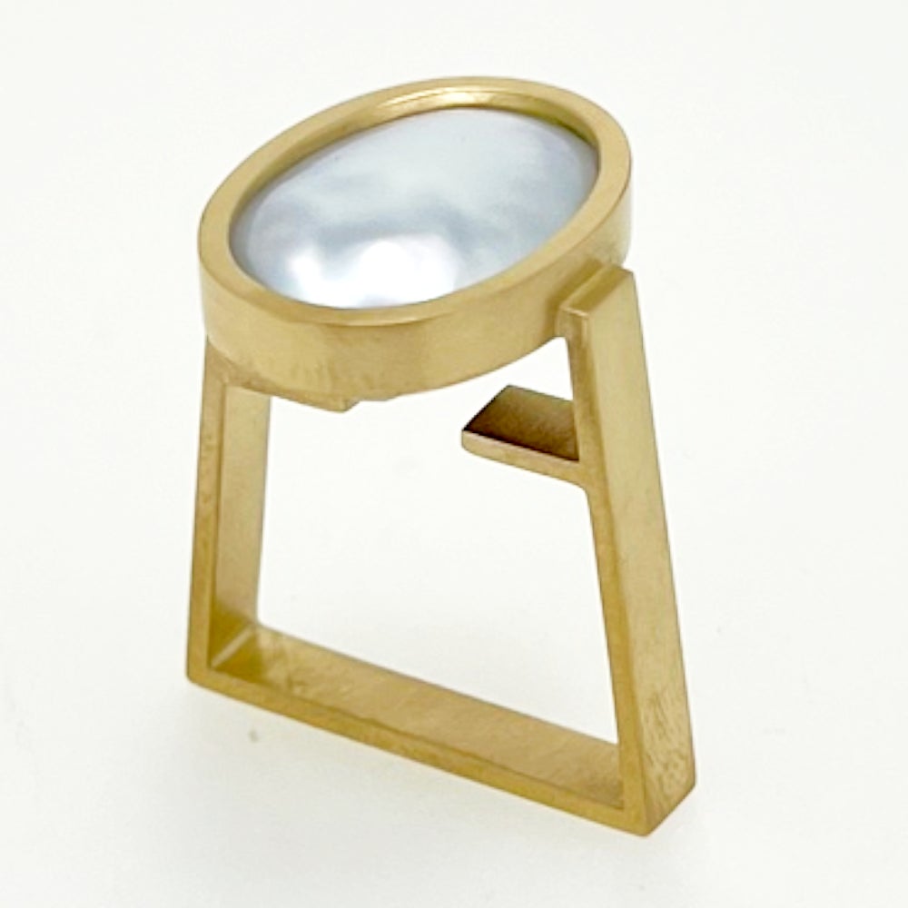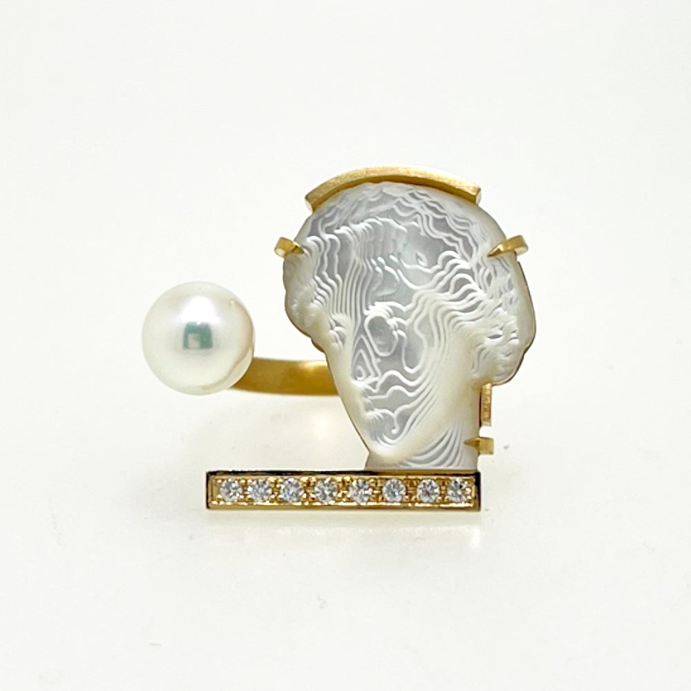 真珠母貝を用いた現代的なカメオをテーマに、機械でしか彫れない形状を追求し生まれた革新的なジュエリー。カメオと真円真珠を組み合わせた新作です。