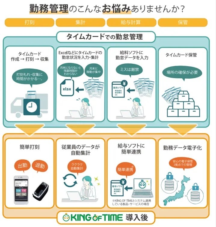 クラウド勤怠管理システム「KING OF TIME」は、管理サーバーやVPNの設置が不要で全拠点の勤怠データをリアルタイムに管理し、給料支払いまでの簡素化、迅速化、管理コスト削減をかなえます。