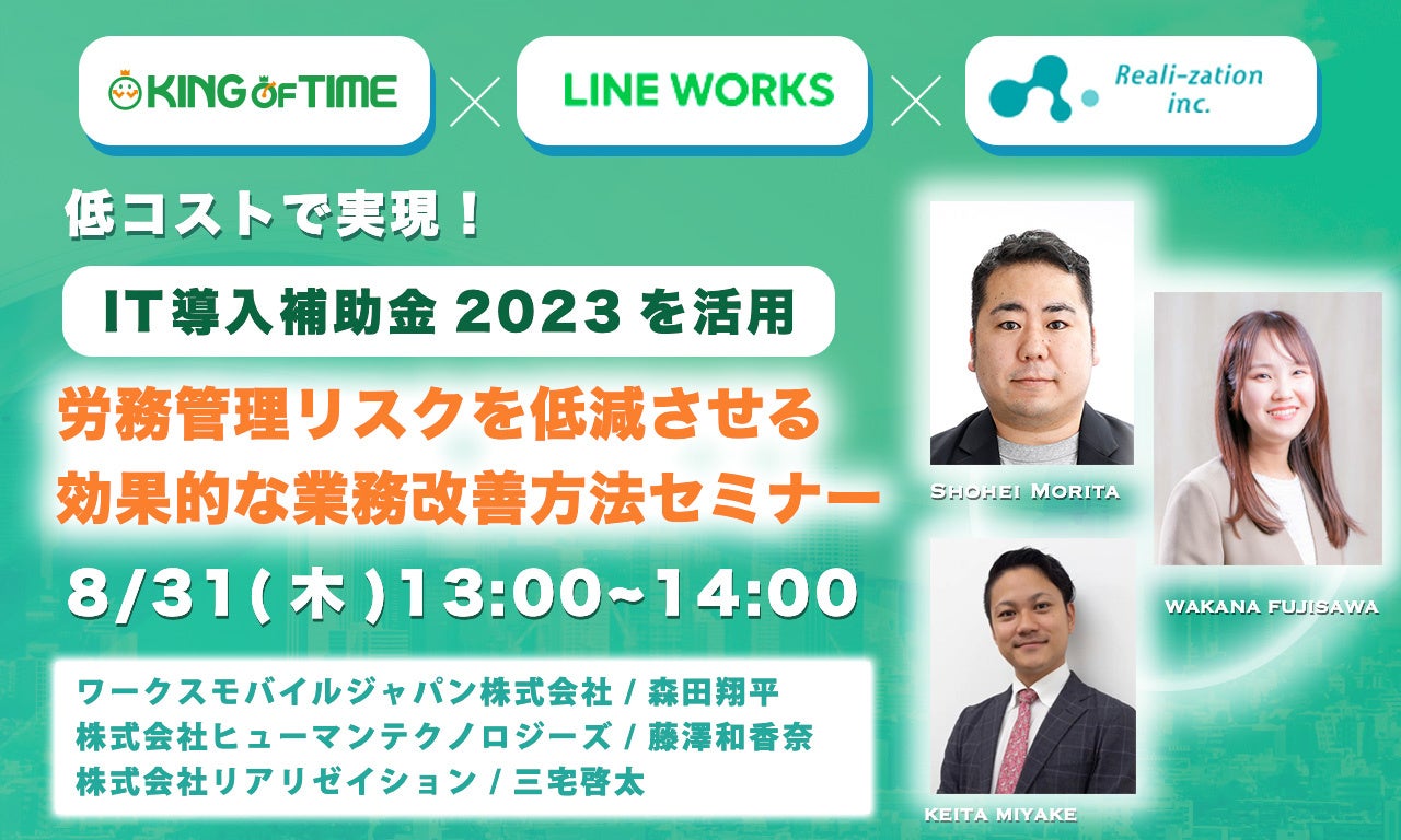 これまで1,000件以上の補助金申請のサポートを行い、40億円を超える申請総額を誇る株式会社リアリゼイション(住所:東京都渋谷区渋谷3-6-2エクラート渋谷ビル4F 代表取締役:森垣洋平)は、KING OF TIMEを開発する「株式会社ヒューマンテクノロジーズ」および「LINE WORKS」を開発する「ワークスモバイルジャパン株式会社」をむかえ、合計3社で、労務管理リスクを低減させる効果的な業務改善方法紹介セミナーを開催いたします。