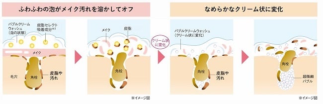 クリーム状に変化することで小さな超微細バブルとなり落ちにくい毛穴汚れをオフします。なめらかなクリーム状のためメイクとなじみ、くすみの原因となる汚れを絡めとります。
