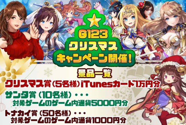 CTW株式会社は、ゲームサービス「G123.jp」公式LINE@にてiTunesカード10,000円分や好きなゲームのゲーム内通貨5,000円分などが当たるクリスマスキャンペーンを開始いたしました。
