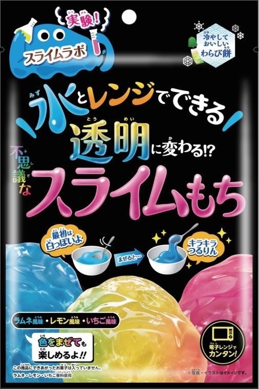 親子で楽しみながら学べる「不思議なスライムもち」を新発売いたします。食べ物とは結びつかないスライムをわらび餅で再現し、安心して美味しく楽しめる商品が誕生しました。粉と水を混ぜ、電子レンジで温めるだけで簡単に青(ラムネ味)、黄色(レモン味)、ピンク(いちご味)のスライムのようなわらび餅を作ることができます。2色の粉を混ぜ合わせると、きみどりやオレンジなどさまざまな色のスライムを作るアレンジも楽しめます。商品を通して三原色を学べるほか、粉と水を混ぜて温めると透明に変わる不思議な現象を体験できるため、夏休みの自由研究にもおすすめです。
