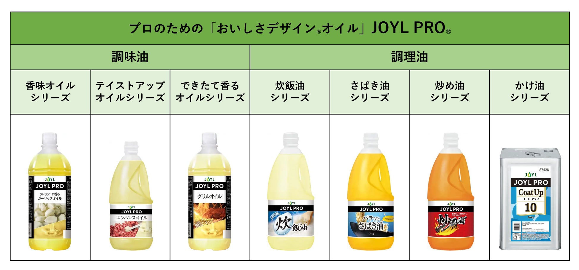 JOYL PRO🄬は大きく調味油と調理油に分かれ、調味油カテゴリーには、時間をかけた本格調理の味わいをつくる「香味オイルシリーズ」、つくりたい味わいを自由自在にコントロールする「テイストアップオイルシリーズ」、できたての風味を持続させる「できたて香るオイルシリーズ」、調理油カテゴリーには、ご飯をふっくらさせ粒感を良くする「炊飯油シリーズ」、麺のほぐれや食感を良くする「さばき油シリーズ」、炒めものを焦がさず食感を良くする「炒め油シリーズ」、米菓・スナックの安定性と食感を良くする「かけ油シリーズ」などがあります。