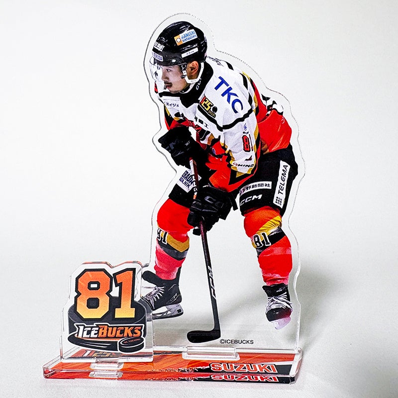 選手がプレーしている姿をアクリルスタンドに落とし込みました。
