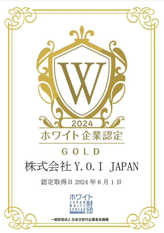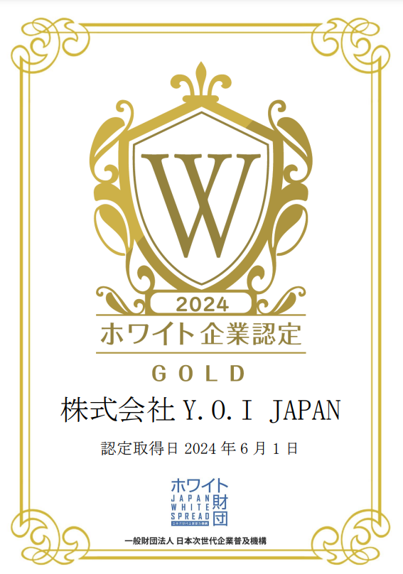 株式会社Y.O.I JAPAN様が、一般財団法人日本次世代企業普及機構(通称:ホワイト財団)が運営する「ホワイト企業認定 ゴールドランク」を取得しましたことをお知らせいたします。