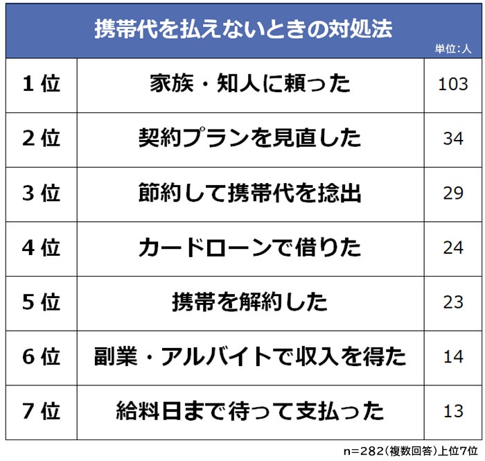 【携帯代を払えないときの対処法ランキング】男女282人アンケート調査