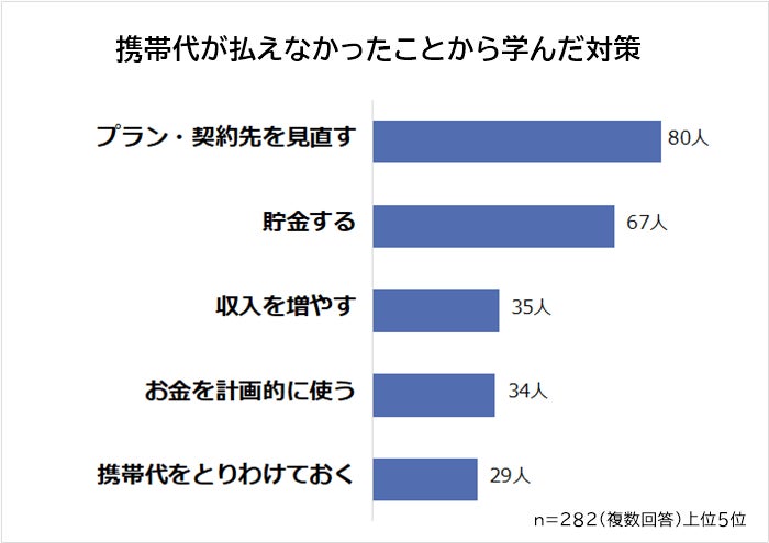 最後に「携帯代を払えなかったことから学んだ対策」を聞いたところ、最も多かったのは「プラン・契約先を見直す(80人)」でした。