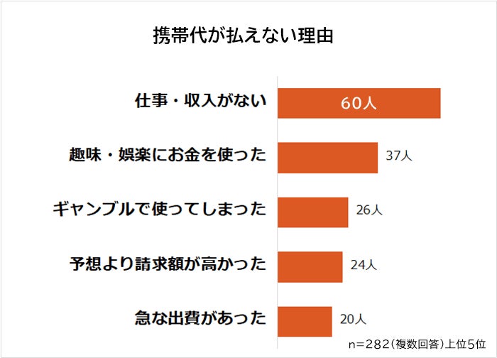 携帯代を払えなくなった経験がある人282人に「払えない理由」を聞いたところ、最も多かった回答は「仕事・収入がない(60人)」でした。