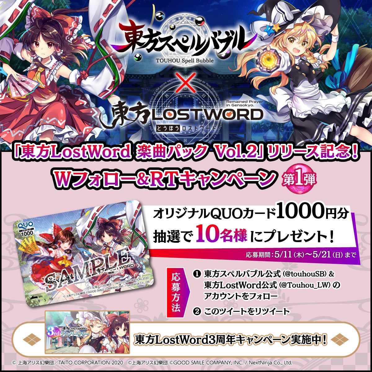東方スペルバブル(@touhouSB)と東方LostWord(@Touhou_LW)公式TwitterアカウントのWフォロー&リツイートでコラボ限定のオリジナルQUOカードを抽選でプレゼント!ぜひ奮ってご参加ください。