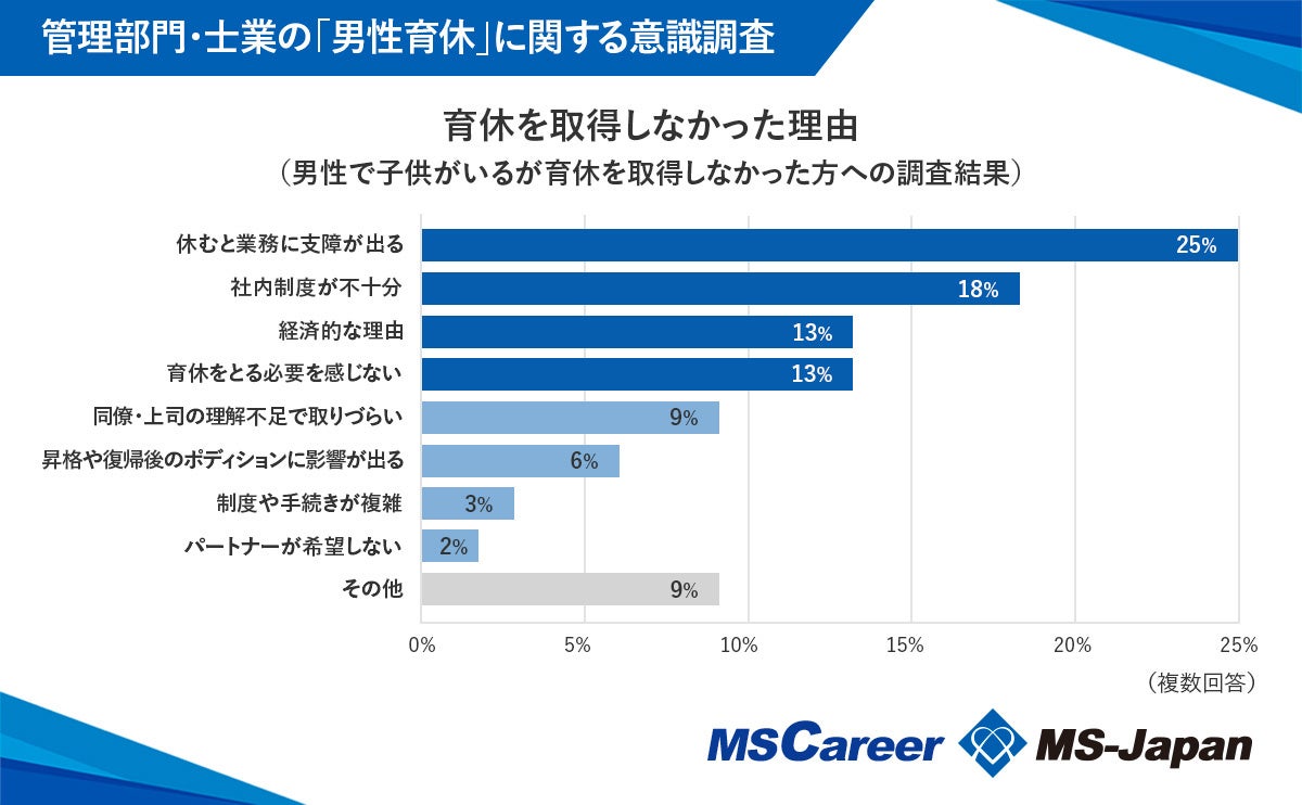 取得意欲と取得率との間に大きな差が明らかになった本調査では、取得しなかった理由に関しても調査を行った結果、最も回答が多かったのは「休むと業務に支障がでる(25%)」、ついで「社内制度が不十分(18%)」、「経済的な理由(13%)」と続き、育休取得の実現のため会社側で対応の余地を感じさせる結果となりました。