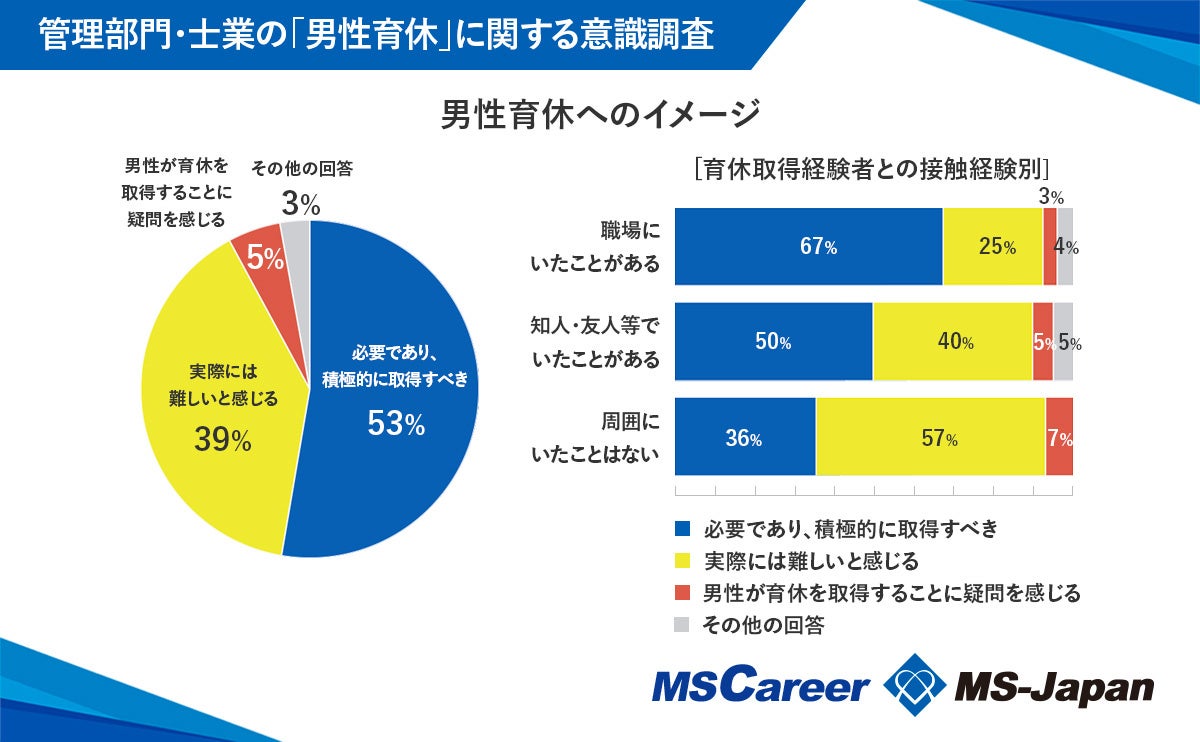男性育休のイメージ、53%が「取得するべき」の一方、39%が「実際には難しい」と回答