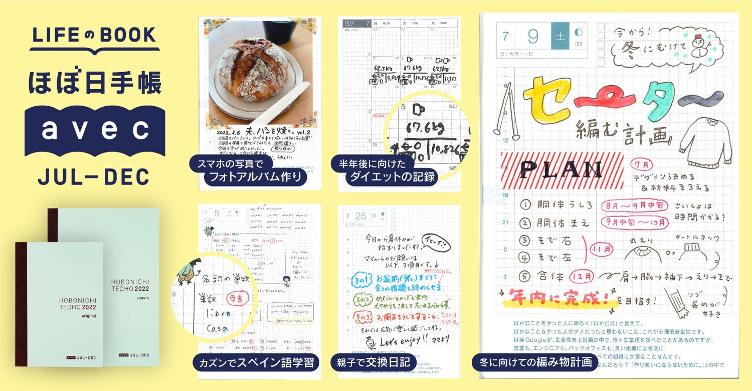 株式会社ほぼ日(本社:東京都千代田区神田錦町、代表取締役社長:糸井重里)は7月はじまりの手帳本体「avec 後期」を2022年6月1日(水)より、ほぼ日手帳公式サイト(ほぼ日ストア)、ほぼ日直営店(TOBICHI東京・京都)、全国のロフトにて販売します。あわせて2022年後半に、手帳をもっとたのしく使っていただけるように、さまざまな使い方をご紹介する特集も掲載しています。ほぼ日手帳とともに、残りの半年間をたのしく過ごしてみませんか?