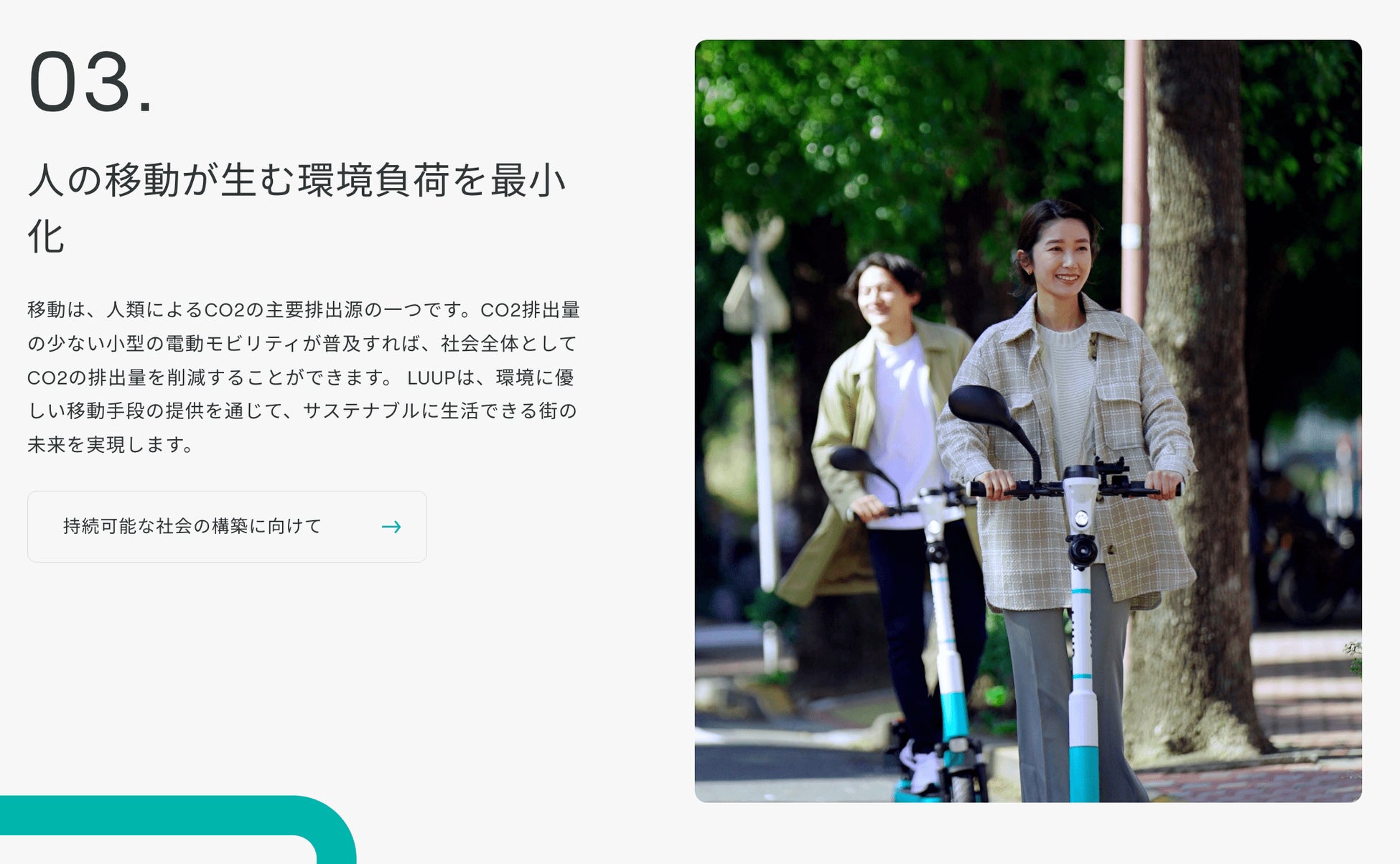 また、LUUPが取り扱う電動・小型・一人乗りのモビリティは、環境負荷の小さい移動手段として世界で普及が進んでいます。具体的な二酸化炭素排出量削減の試算等も含めて、持続的な社会の構築のためにLuupができることを改めて言語化し、掲載しました。