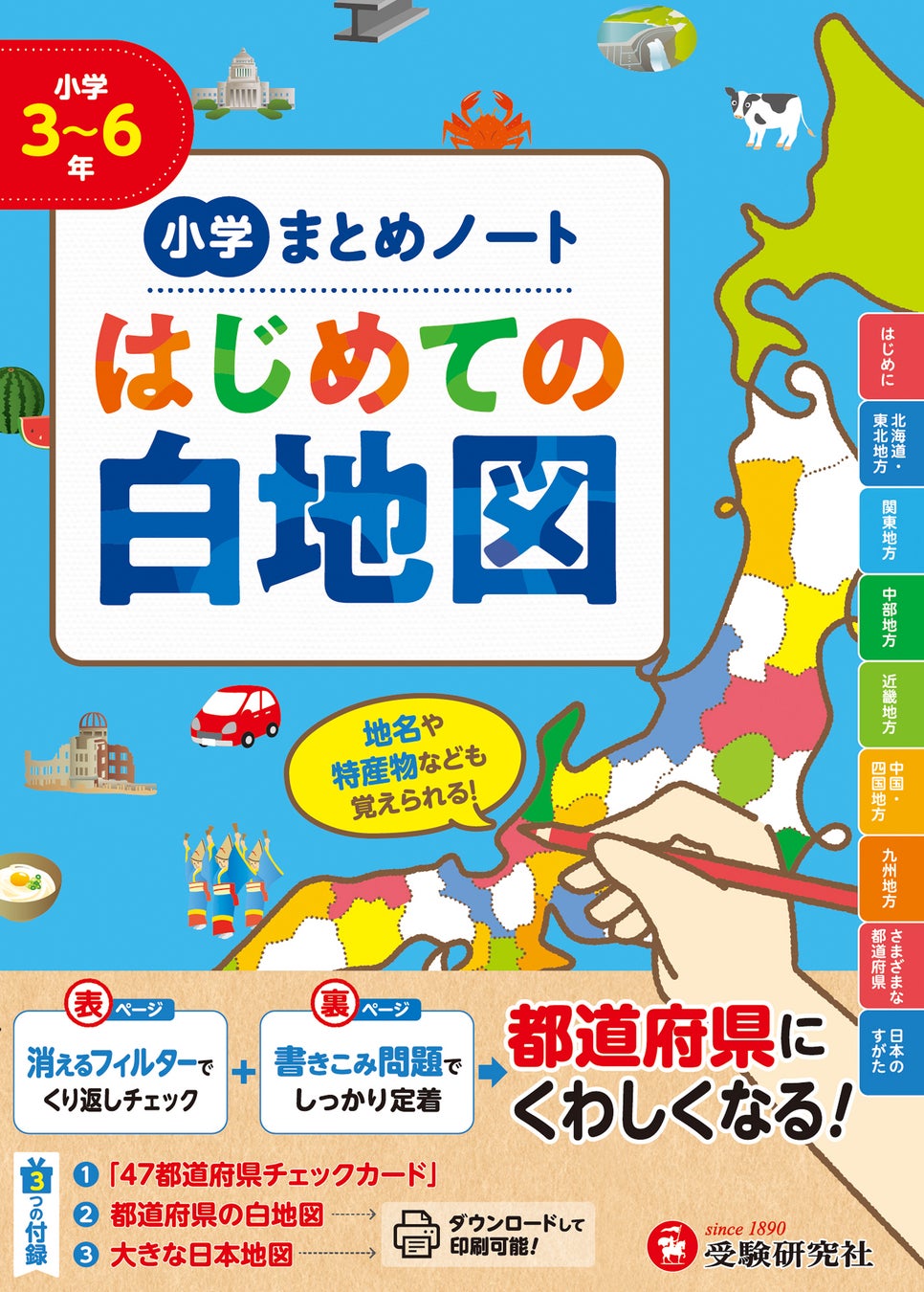株式会社増進堂・受験研究社(本社:大阪市西区、代表取締役:岡本泰治)は、「消えるフィルター」と「書きこみ問題」で、小学3・4年生が学習する都道府県の基本から、日本の国土の様子までマスターできる『小学 まとめノート はじめての白地図』を2026年3月10日より発売いたします。