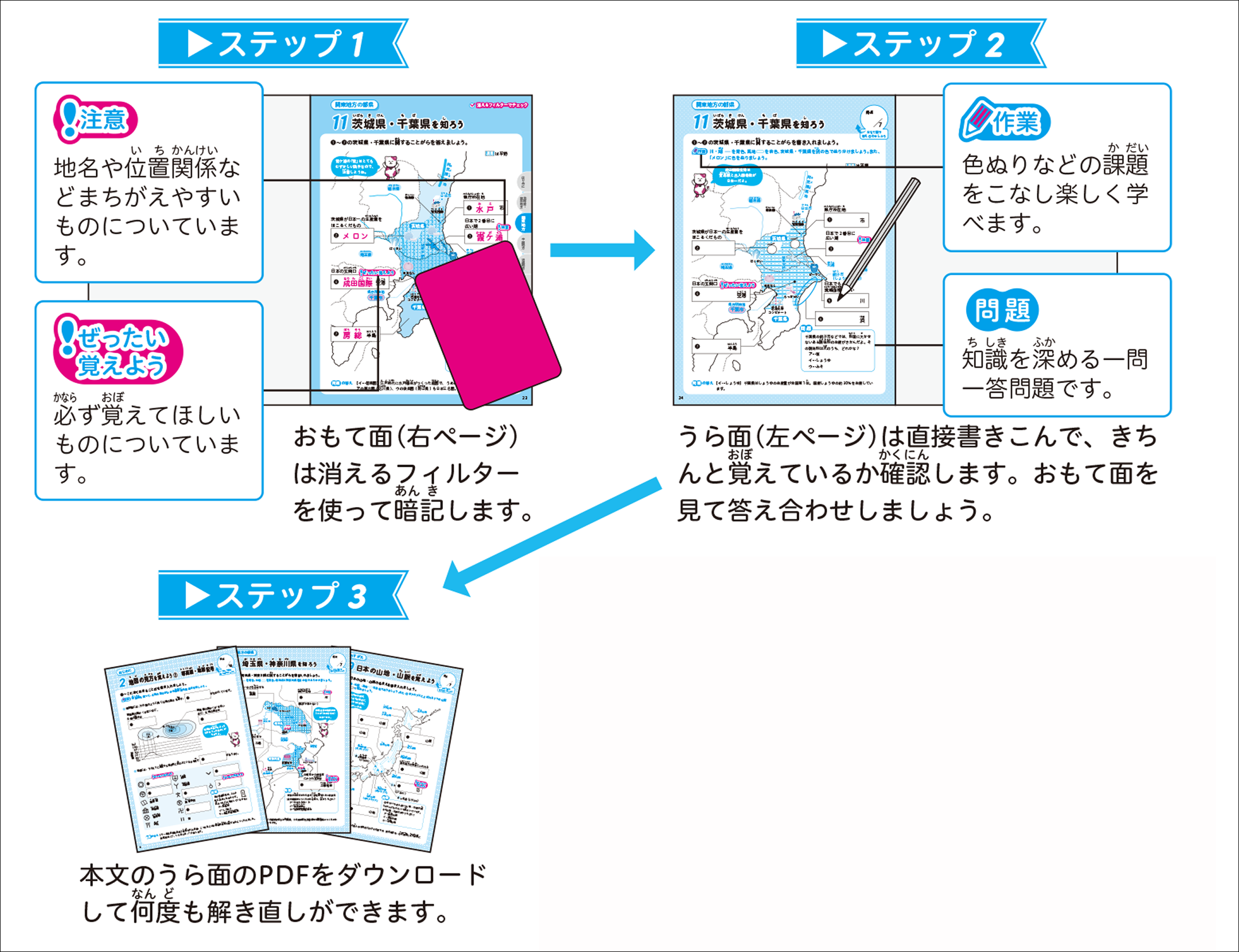 ●知識がしっかり定着!くり返し学習ができる3ステップ