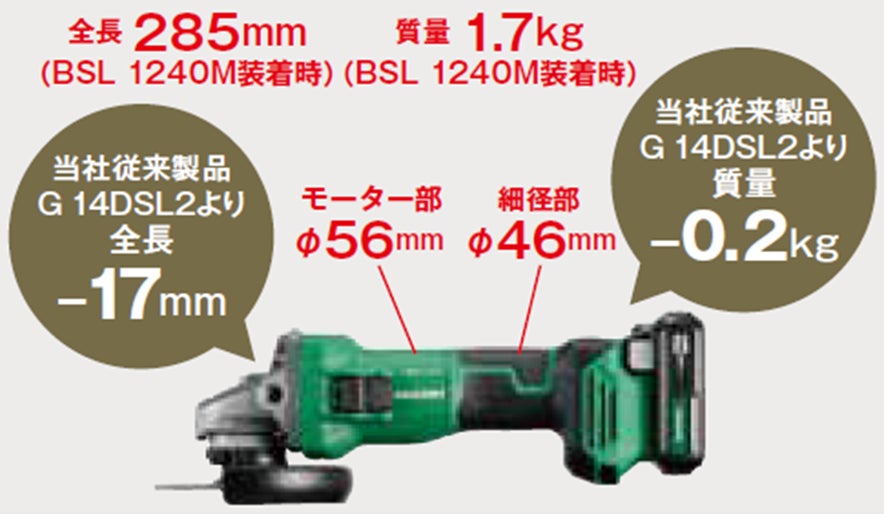 当社従来製品G 14DSL2と比較して、全長-17mm、質量-100g、モーター部直径-2mmとコンパクト・軽量・スリムボディを実現し、より使いやすくなっています。