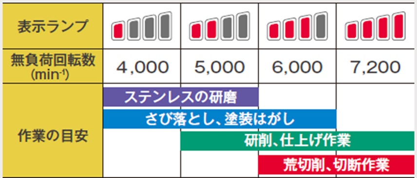 4段階変速でステンレスの研磨から切削・切断作業まで、幅広い作業に対応します。回転数切替スイッチを押すことで、トイシの回転数を用途に応じて選択することができます。