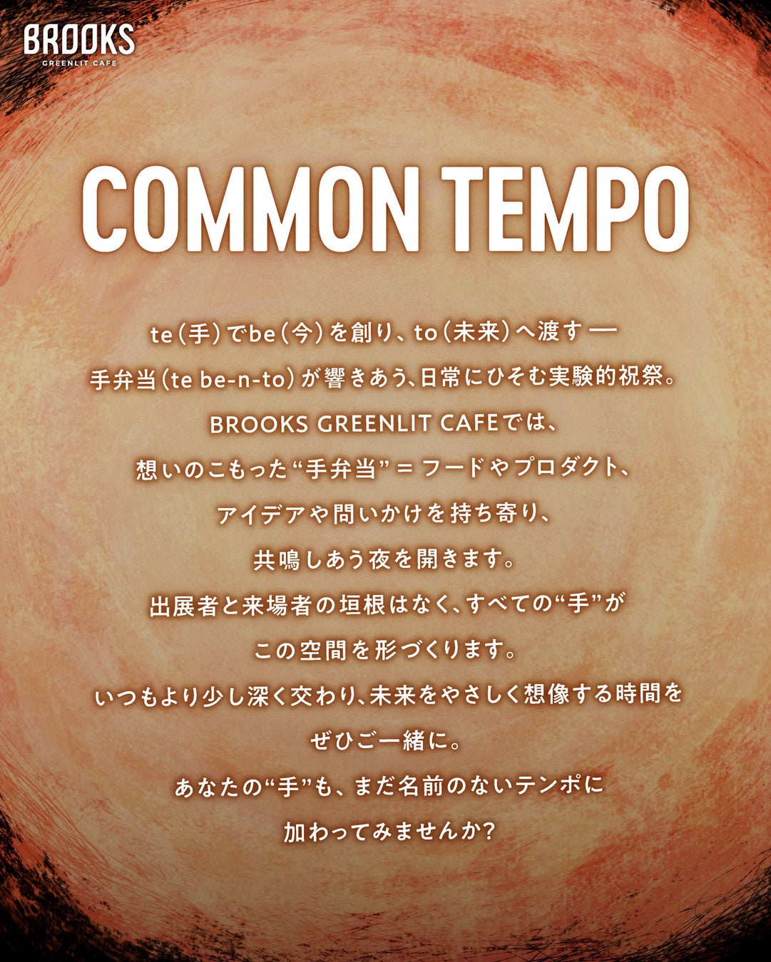 株式会社大泉工場(本社:埼玉県川口市、代表取締役:大泉寛太郎、以下、当社)は、当社が運営する「BROOKS GREENLIT CAFE(ブルックス・グリーンリット・カフェ)」(東京都港区南青山)において、新たな定期イベント「COMMON TEMPO(コモン・テンポ)」を始動いたします。その初回を2025年6月9日(月)19時より開催します。