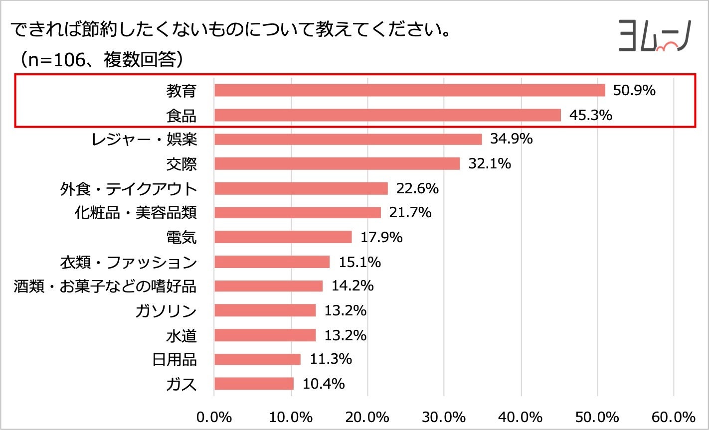 - できれば節約したくない費目上位は「教育」「食品」