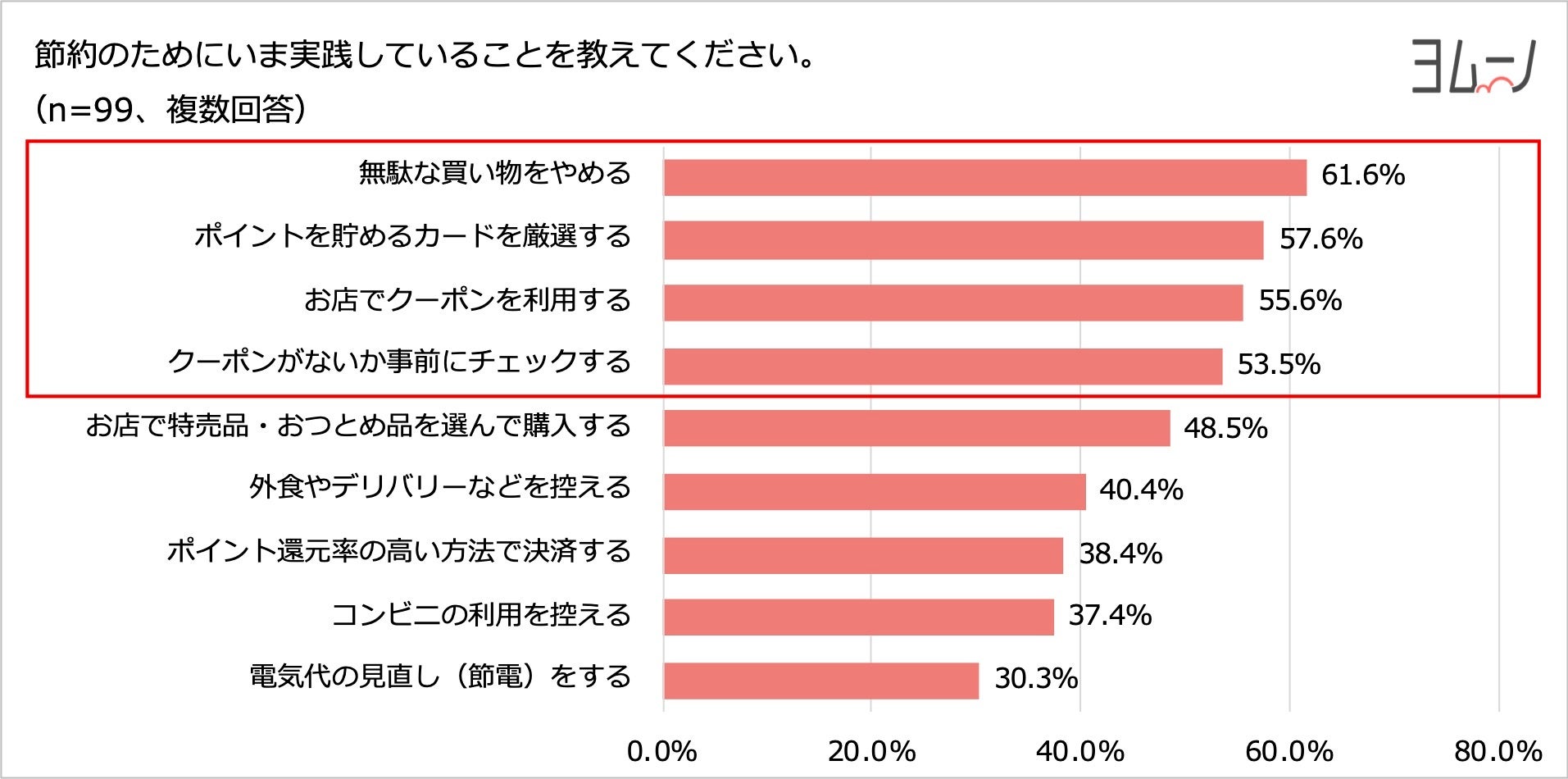 - 現在、実践している家計防衛策は「無駄な買い物をやめる」「ポイントカードやクーポンを活用する」