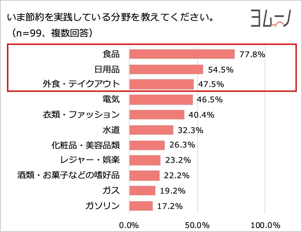 - 現在、節約を意識している人は約9割、節約している分野は「食品」「日用品」「外食・テイクアウト」