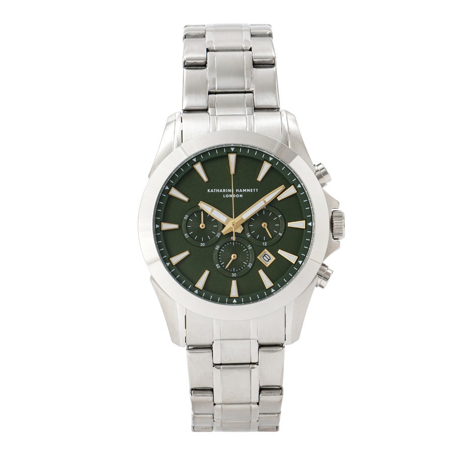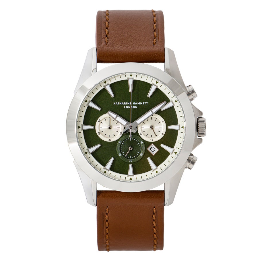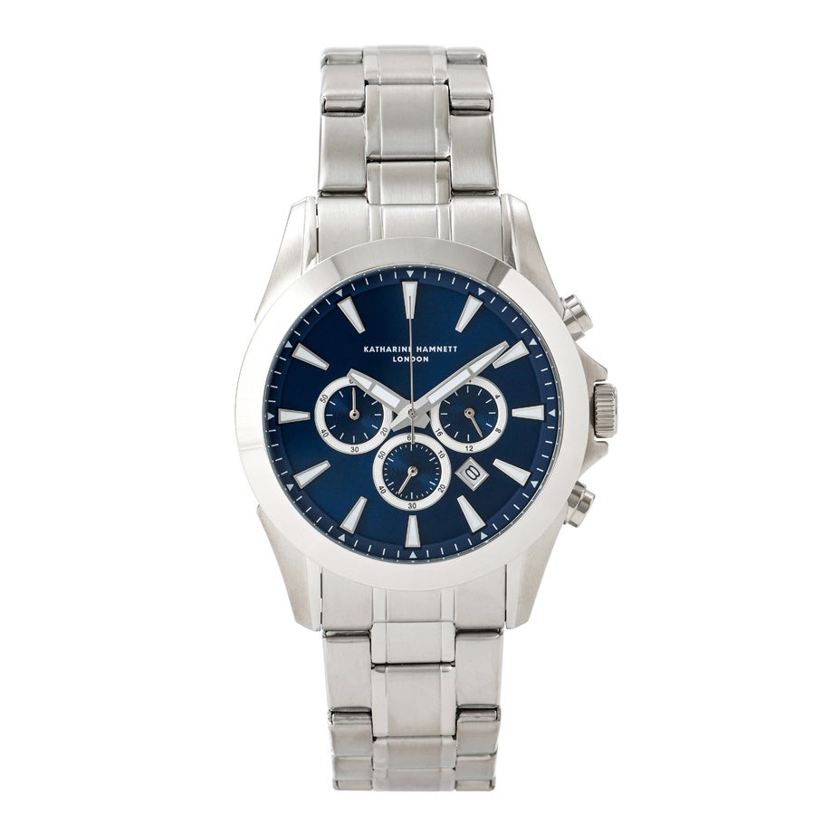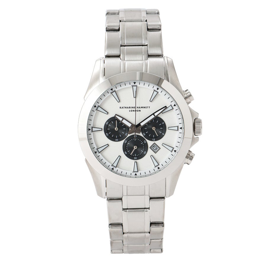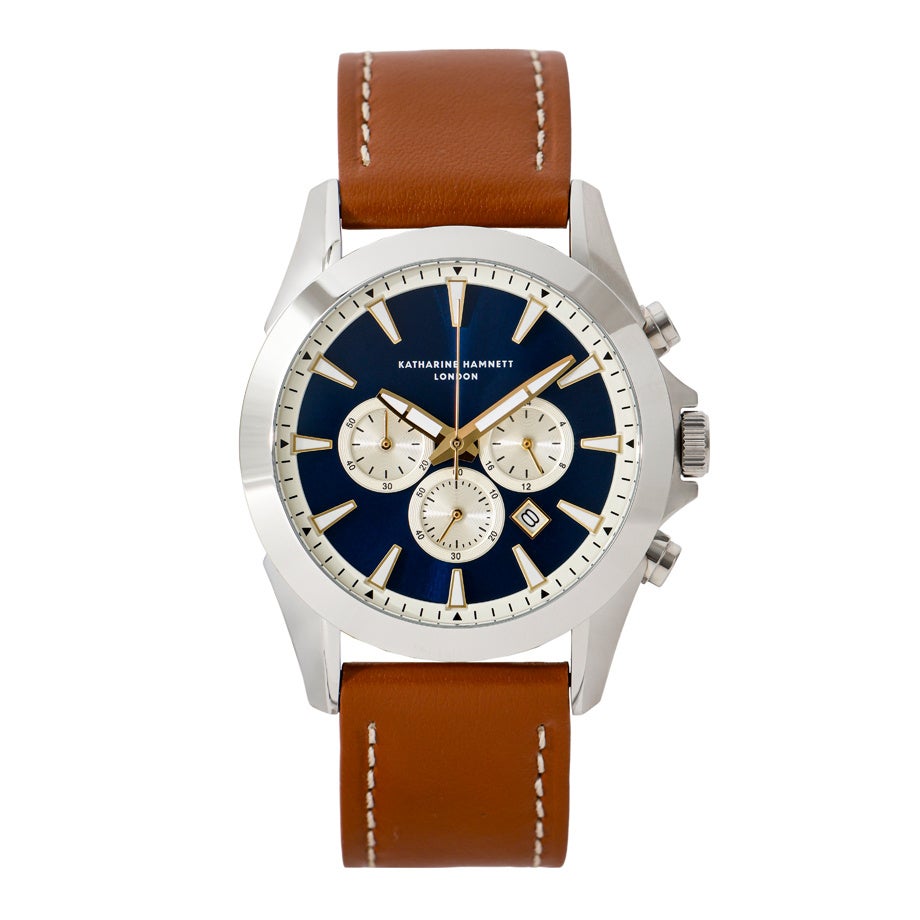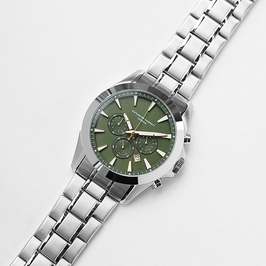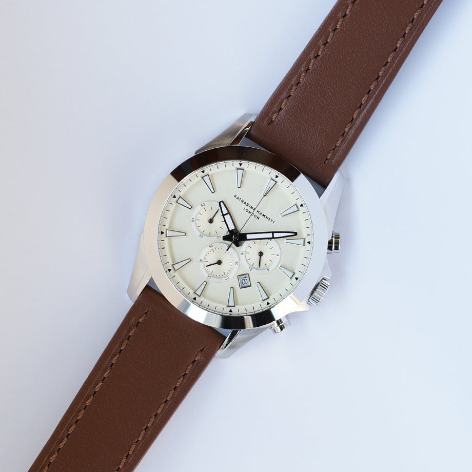 キャサリン ハムネット ロンドン クロノグラフは、オーセンティックなクロノグラフをベースとしながら、立体的なダイヤルやカラーリングが大人らしいカジュアルなイメージも感じさせるデザイン。