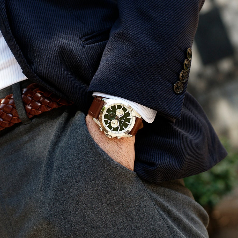 オーセンティックなクロノグラフに、立体的なダイヤルと洗練されたカラーリングを融合。ビジネスにもカジュアルにも映える、デザイン感が魅力のクロノグラフ。時計専門店タイムタイム別注モデルです。