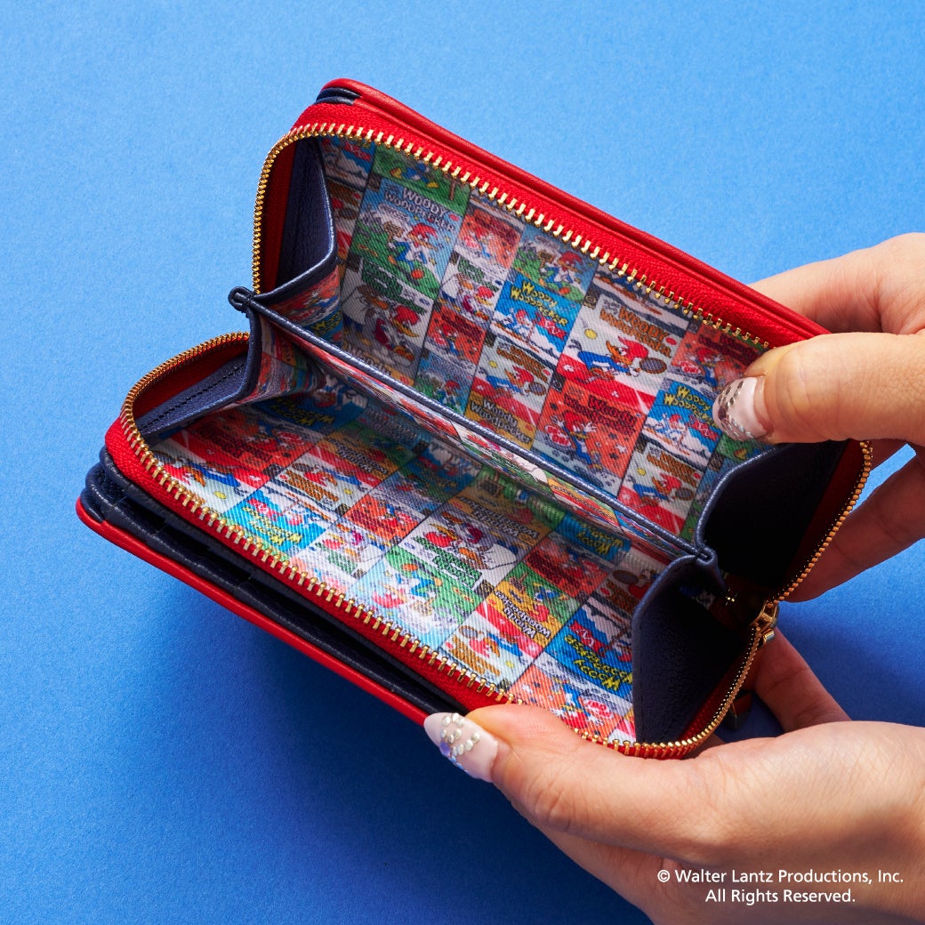 お財布とスマホショルダーの裏地は鮮やかな「ウッディー・ウッドペッカー」のコミック総柄。遊び心のあるアートに心躍るデザインシリーズ。