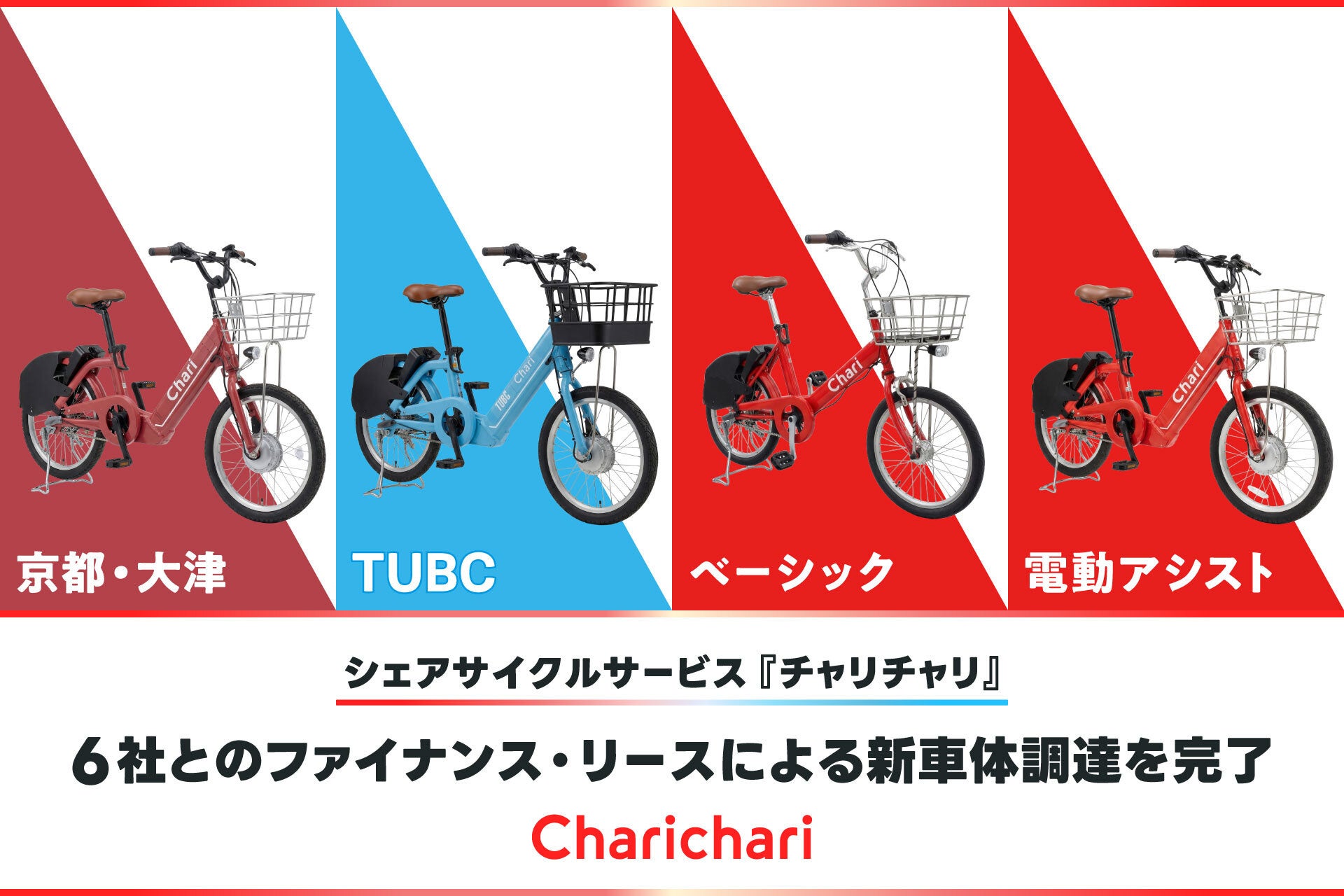 シェアサイクルサービス『チャリチャリ』を運営するチャリチャリ株式会社(本社:福岡市中央区、代表取締役:家本 賢太郎、以下「チャリチャリ」)は、2026年2月〜3月において、株式会社九州リースサービス、佐銀リース株式会社、ひろぎんリース株式会社、りそなリース株式会社、FFGリース株式会社、MUFGファイナンス&リーシング株式会社の6社と連携し、京都・大津エリアの本格展開や既存エリアの需要増加に対応するため、ファイナンス・リース(以下「リース」)による新車体調達を実施いたしました。なお、ひろぎんリース株式会社、FFGリース株式会社、MUFGファイナンス&リーシング株式会社の3社とは今回新たに取り組みを開始しました。
