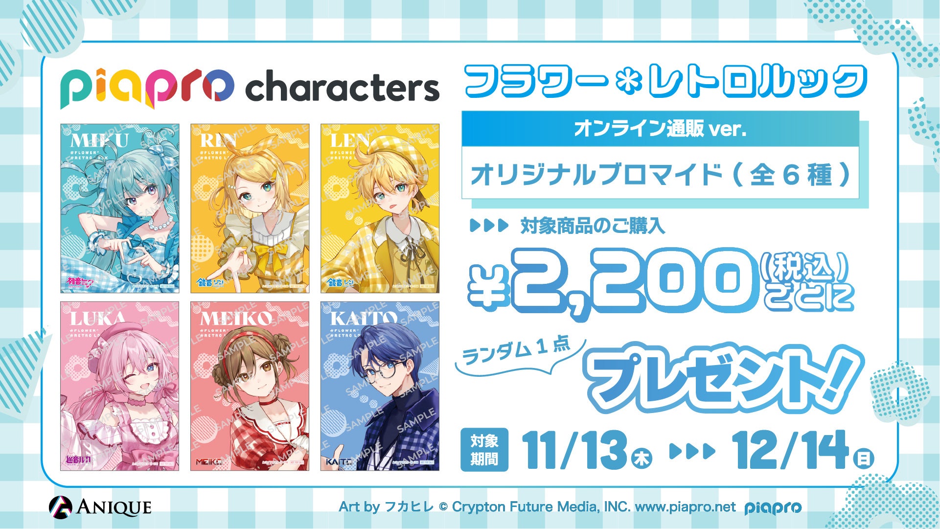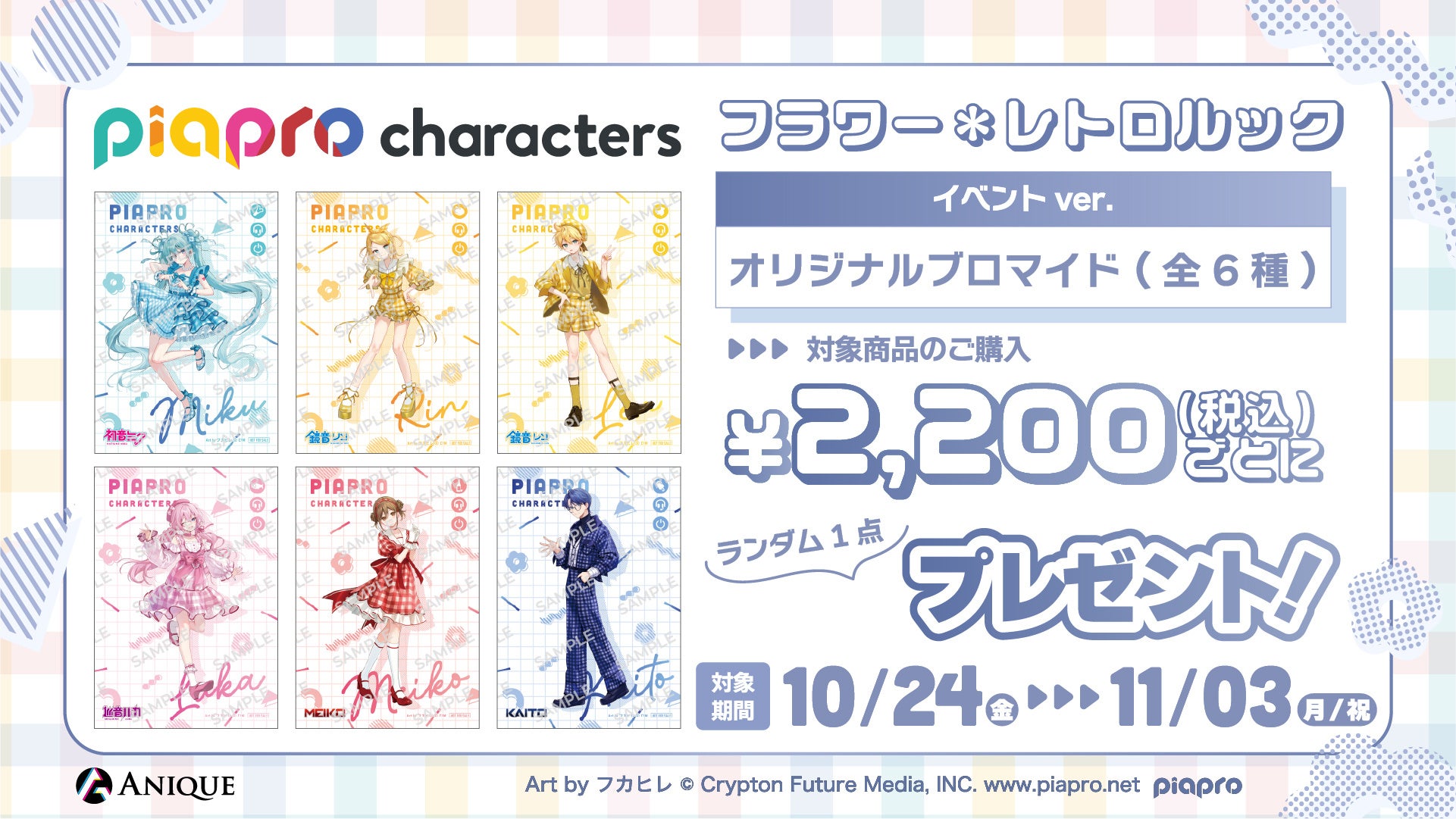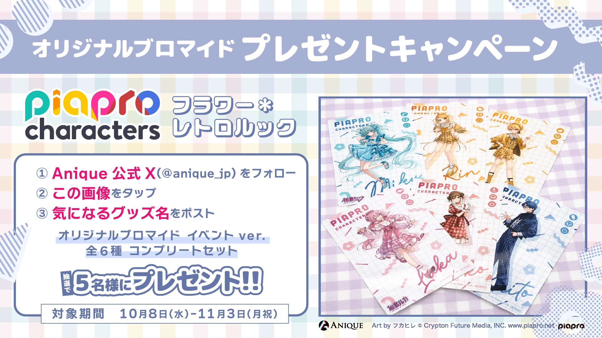 Anique株式会社(本社:東京都千代⽥区、代表取締役:笠井⾼秀)は、『ピアプロキャラクターズ』よ り、【フラワー*レトロルック】をテーマにした新規描き下ろしイラスト使⽤のカラフルなオリジナルグ ッズと、体験型ワークショップを楽しめるPOP UP SHOPを開催いたします。