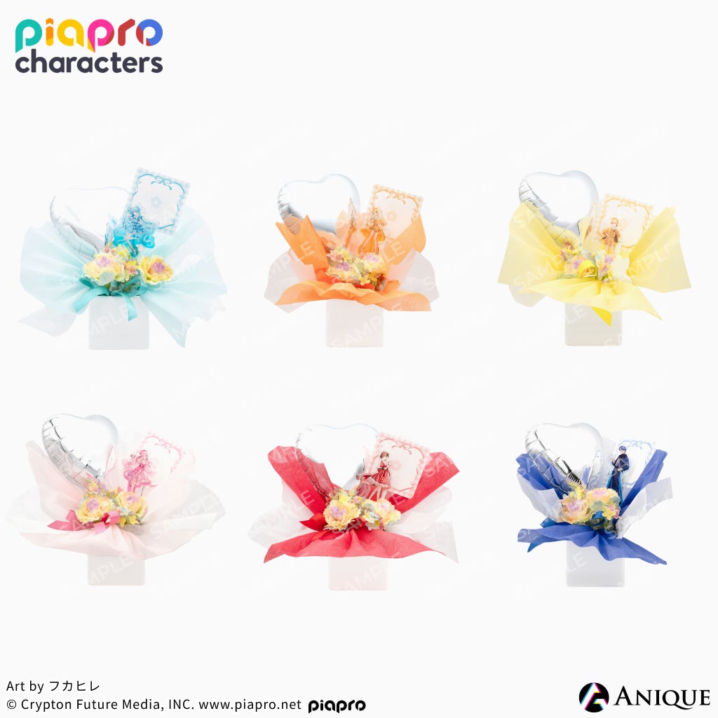 イラストレーター:フカヒレ氏 描き下ろしのレトロルックに⾝を包んだピアプロキャラクターズの新商品を販売するほか、新宿マルイ会場ではミニフラワースタンドの参加型ワークショップも開催いたします。