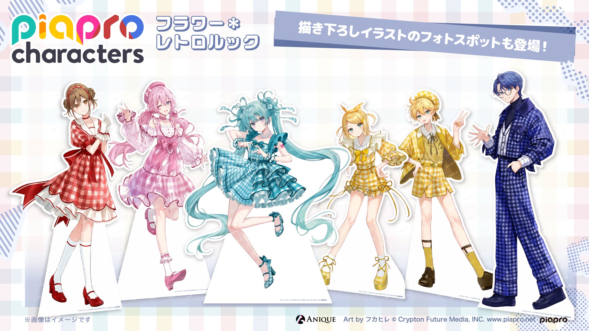 会場には新規描き下ろしイラストを使⽤した、ピアプロキャラクターズ6⼈の等⾝⼤パネル等のフォトスポットが登場いたします。