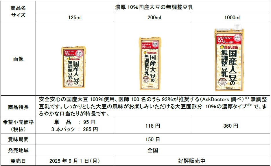 マルサンアイ株式会社(本社:愛知県岡崎市、代表取締役社長:堺 信好)は、しっかりとした大豆の風味が感じられる無調整豆乳としてご好評いただいている「濃厚10%国産大豆の無調整豆乳」に、飲み切り125mlサイズ(単品/3本パック)を追加し、2025年9月1日(月)より全国で発売します。