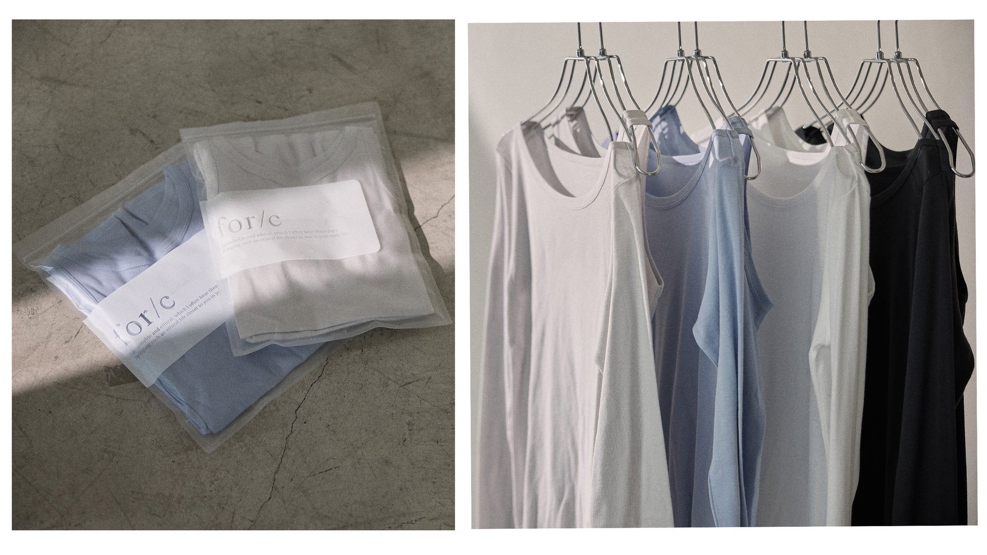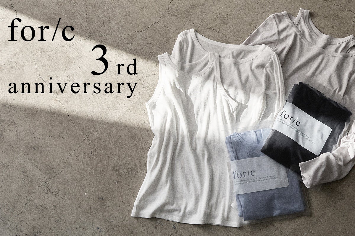 3周年を記念して、レイヤードをお楽しみいただけるシアーロンT×タンクトップセットとベーシックに着まわせるタンクトップ2pセットを発売いたします。2型ともfor/cオリジナルのリサイクルパッケージに入れて発送いたします。