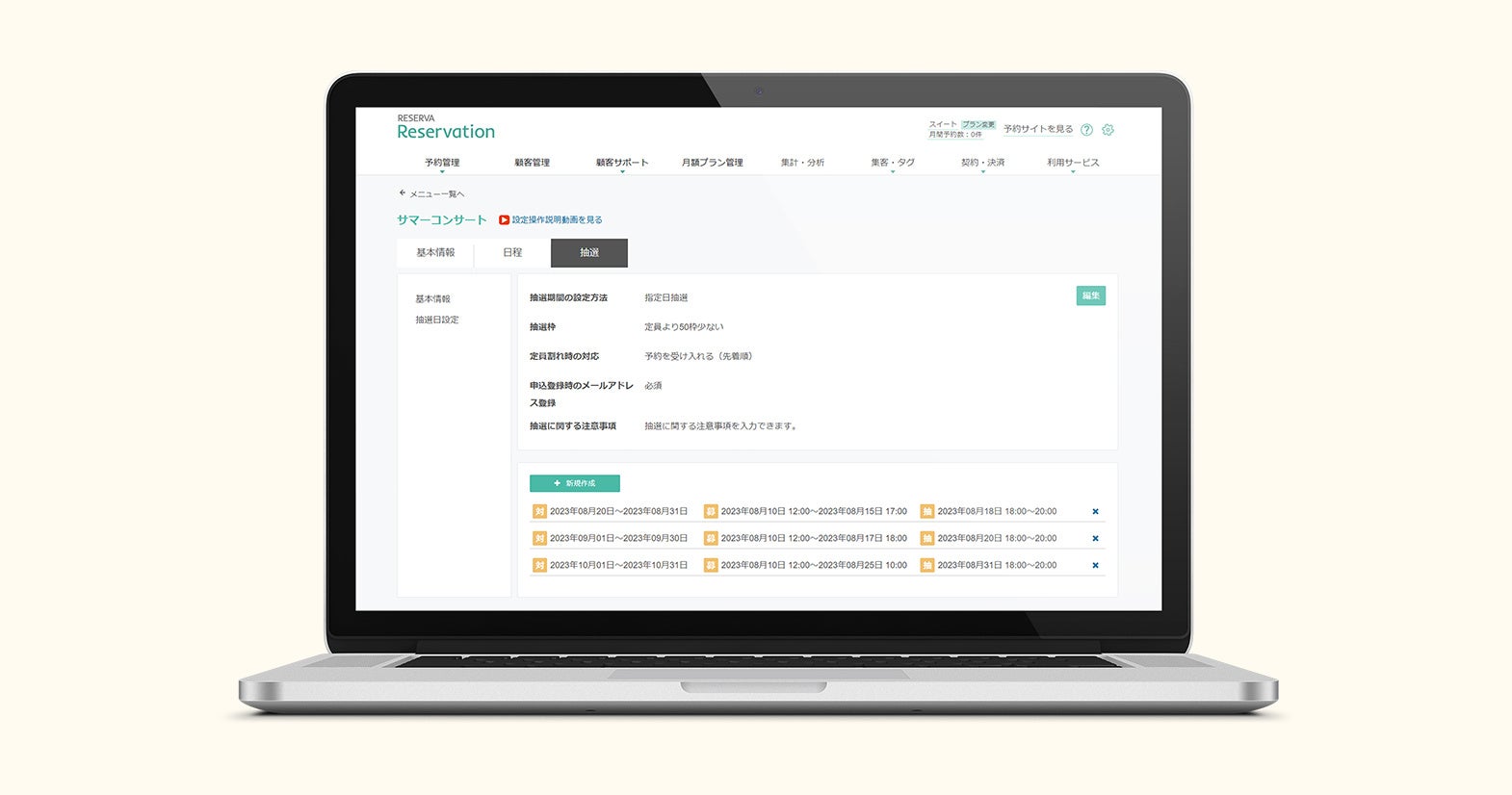 抽選予約機能を利用した「RESERVA」予約システムの管理画面サンプル