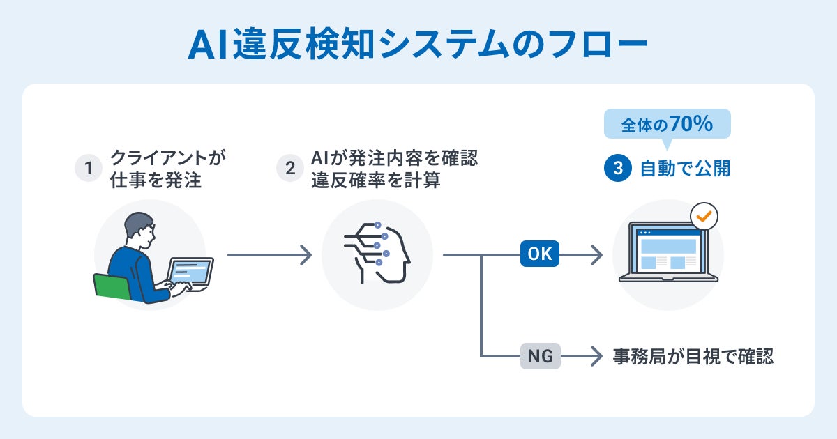 「AI違反検知システム」は、AIが発注内容を確認し、利用規約違反がないと判断された仕事を自動公開するシステムです。本システムを開発・導入した結果、全体の70%の仕事が自動公開され、登録から公開までの時間が最短1秒に短縮されました。この工数削減に伴い、自動公開対象以外の仕事についての目視確認時間も効率化され、案件ごとの仕事公開までの時間は、平均6時間から1時間未満に大幅短縮されました。