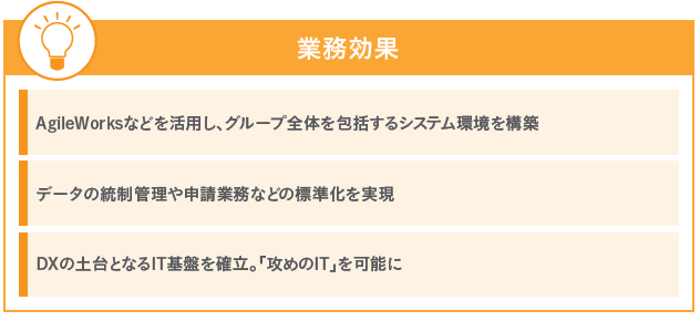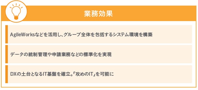AgileWorksなどをキーツールとして活用することでグループ会社のシステム統合を実現し、内部統制強化に加えDX推進にも貢献
