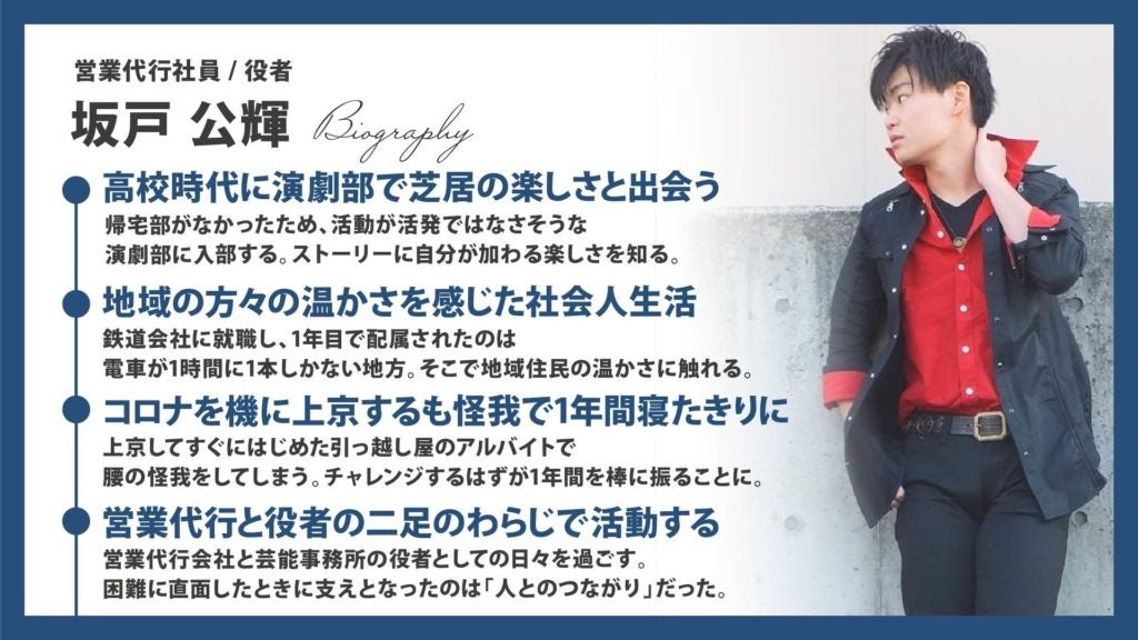 岩手県出身の24歳。高校卒業後は鉄道会社に就職し、地域密着型の駅員として勤務するも20歳で退職。その後地元岩手県の芸能事務所にオーディションを受け所属。テレビリポーターやラジオパーソナリティ、舞台役者として活躍する。もっと専門的に演技の勉強をしたいという思いから上京し現事務所に所属。同時期の2021年9月に株式会社営業ハックにも入社。1人の営業パーソンとして、営業ハックの情報発信の運営や営業代行事業に携わりながら、再現VTRや映画、ドラマ等に出演しながら演技の勉強に勤しんでいる2足の草鞋を履く生活を送っている。