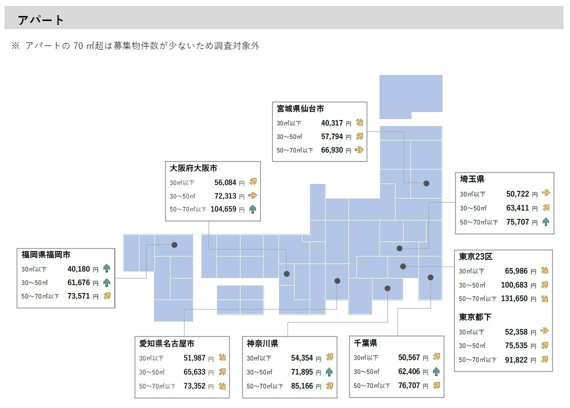 - アパートは、東京都下・神奈川県・埼玉県・千葉県・大阪市・福岡市が全面積帯で前年同月を上回る。カップル向きの上昇が目立ち5エリアで2015年1月以降最高値を更新。