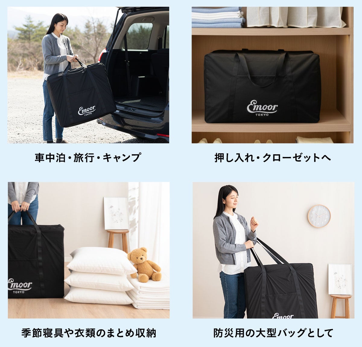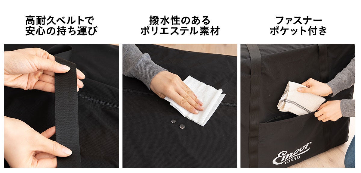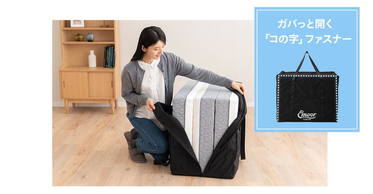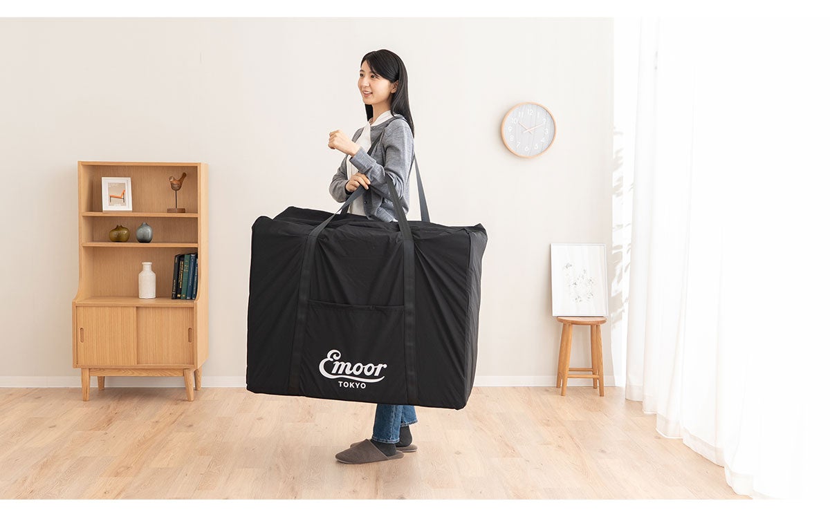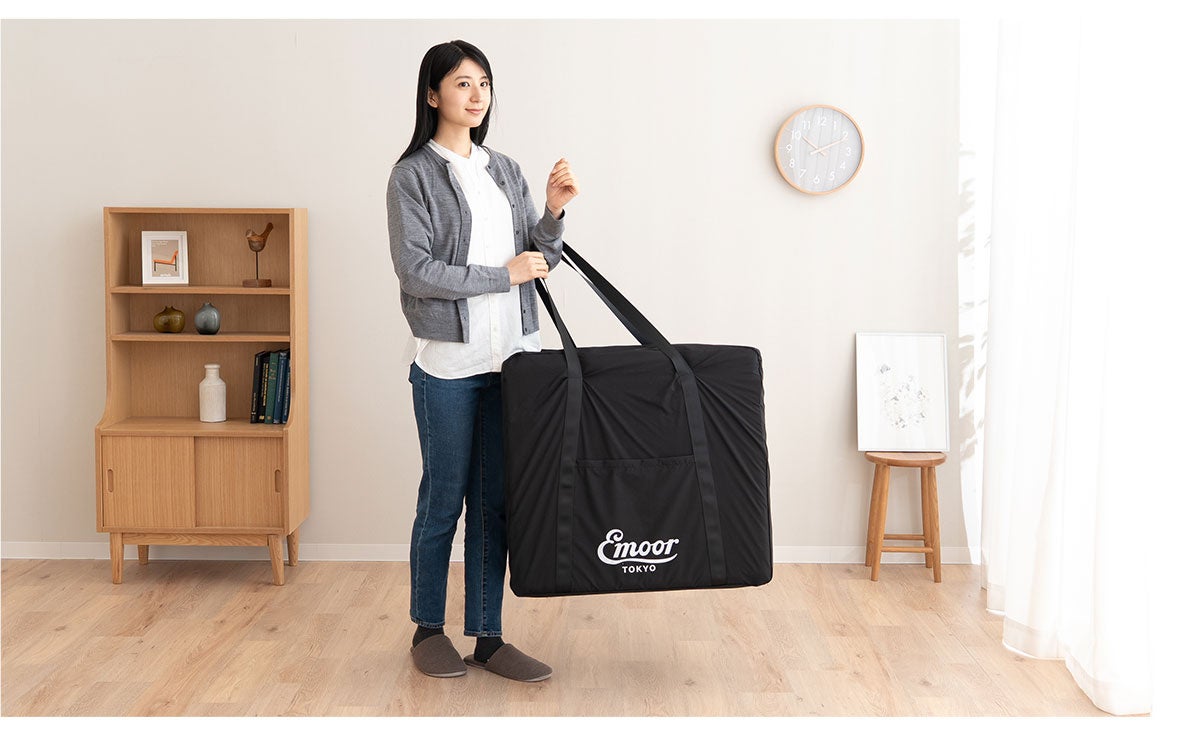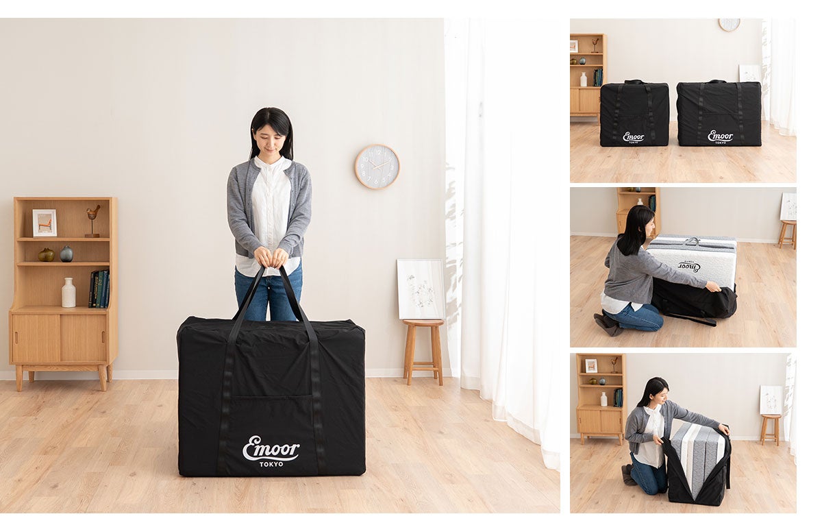 コンパクトサイズの豊富なマットレスを開発する寝具ブランドEMOOR(エムール)から、収納と持ち運びを考えた「ごろ寝マットレス用収納バッグ」が新登場。収納も移動もスマートに。