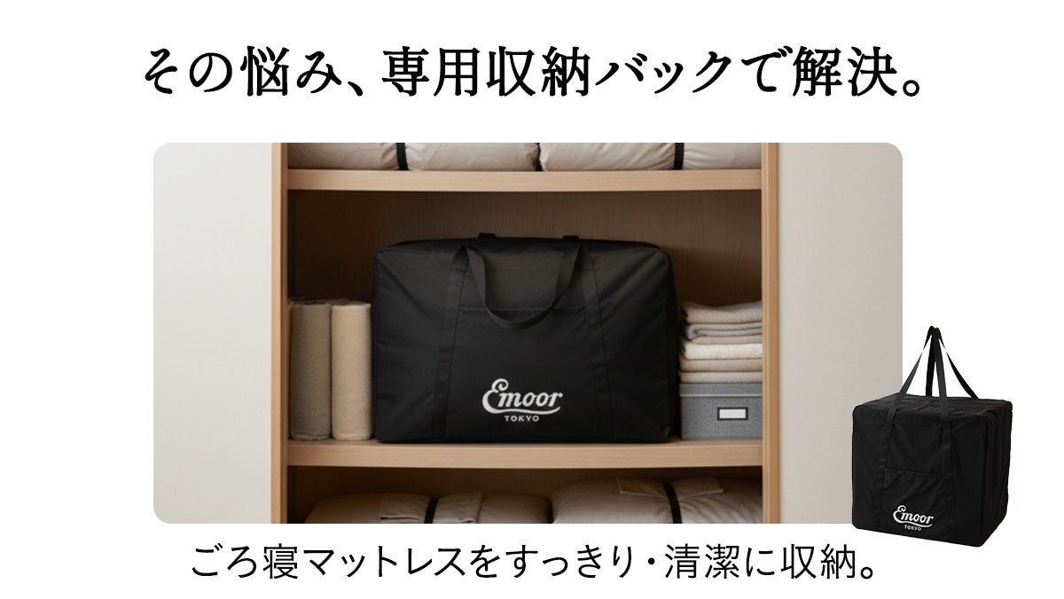 「身体に合った寝る・座る・たたむ」を提供する健康家具ブランドEMOORを展開する株式会社エムール(東京都立川市:代表取締役 高橋 幸司/以下、エムール)は、2026年2月25日より「ごろ寝マットレス専用収納バッグ」の販売を開始しました。