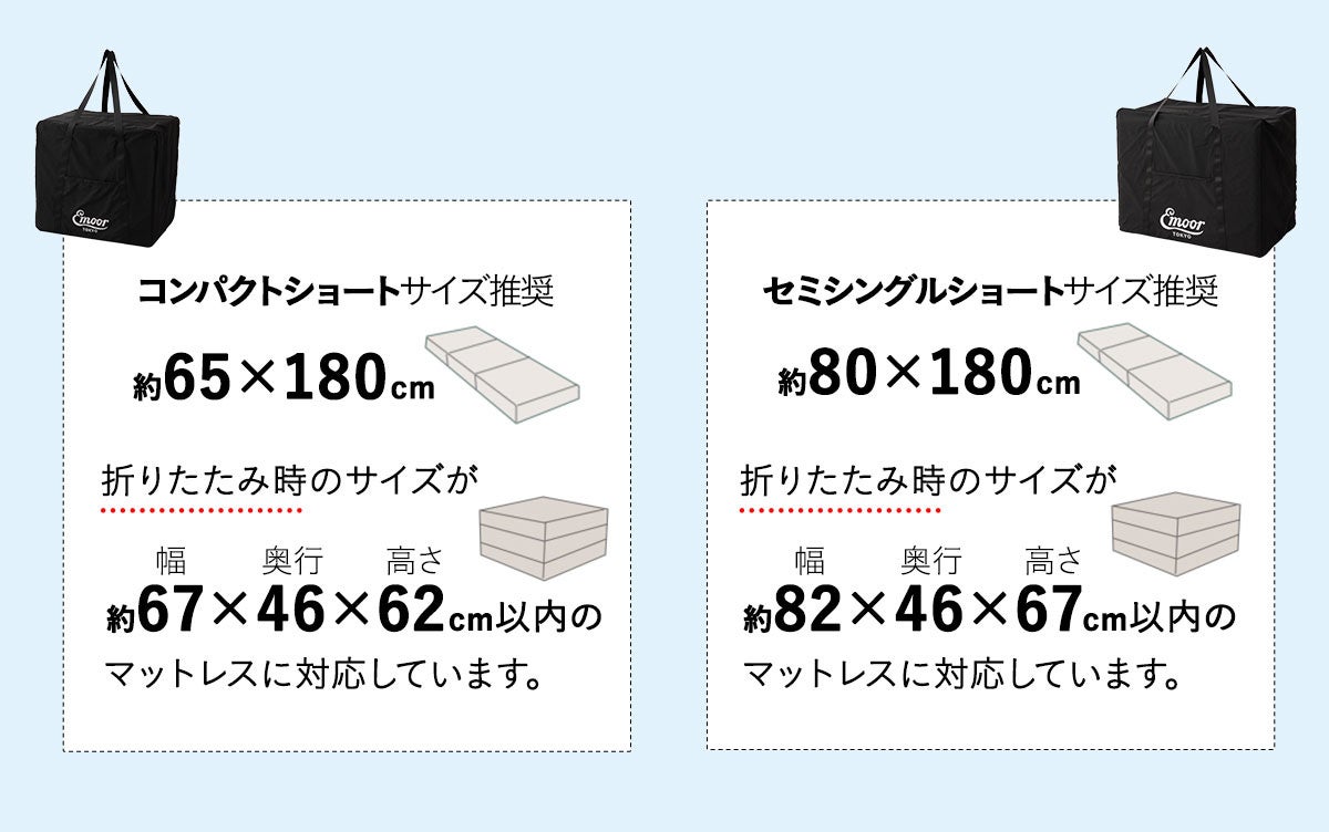 狭小住宅に対応したコンパクトサイズのマットレスを多数開発するエムールから、コンパクトサイズのマットレス専用の収納バッグが新登場しました。コンパクトマットレス(別名:ごろ寝マットレス)の収納性をさらに高めるアイテムです。