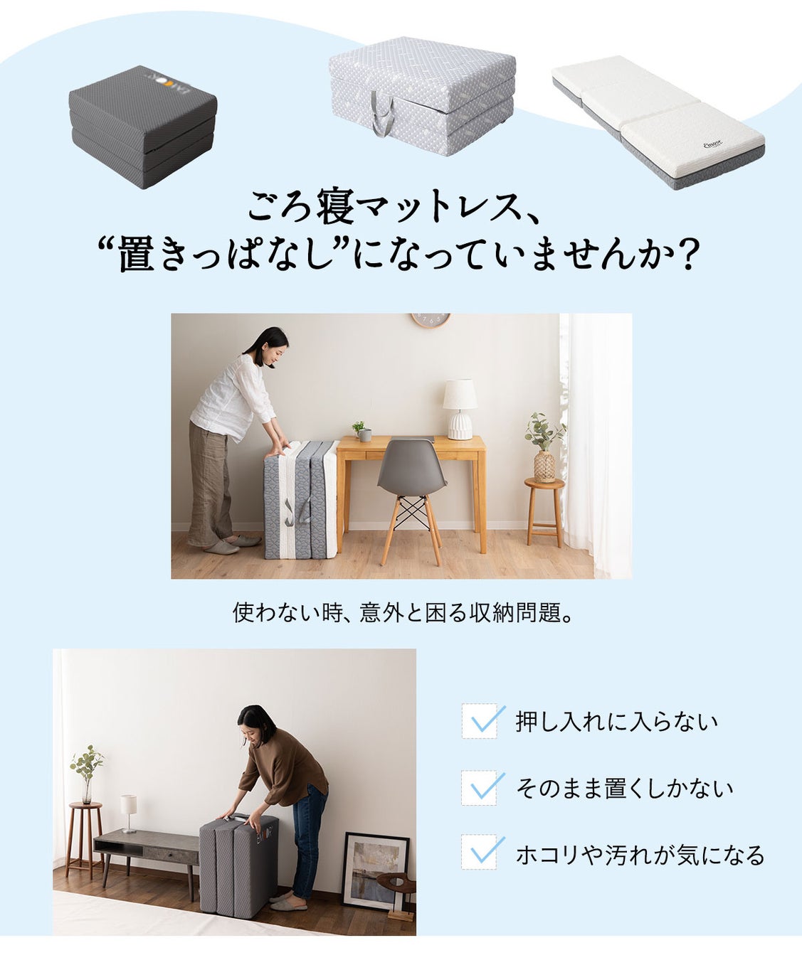 コンパクトサイズの三つ折りマットレスの形状に合わせた専用設計。折りたたんで入れるだけで無駄なく収まり、収納時も見た目すっきり。押し入れや移動時も扱いやすい設計です。
