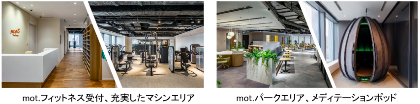 健康・運動促進施設「mot. 三井のオフィス for Tomorrow / Mitsui Office for Tomorrow」(9~10 階)。テナント企業専用の貸会議室・個室や無料ラウンジ、フィットネスジム、メンバーズラウンジなどのテナント企業向け会員制施設・サービスを提供。集中力を高めるため、リフレッシュルームやシャワーの利用、仕事前後やすきま時間での運動、メディテーション(瞑想)ポッドによるリフレッシュなど、ワーカーの心身ともに健康的な働き方をトータルにサポートします。