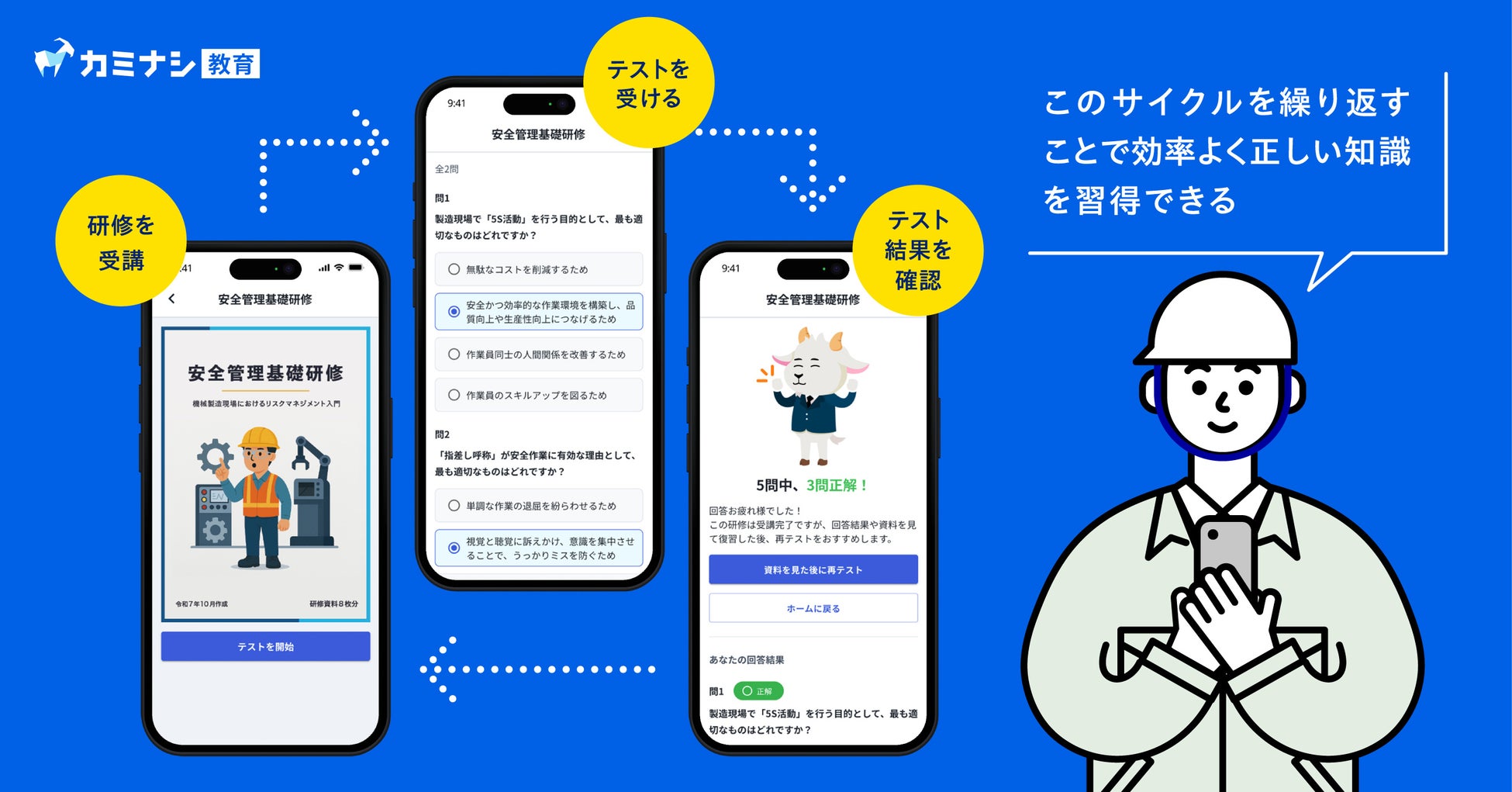 現場DXプラットフォーム『カミナシ』シリーズを提供する株式会社カミナシ(本社:東京都千代田区、代表取締役CEO:諸岡 裕人、以下「カミナシ」)は、動画マニュアル・研修システム『カミナシ 教育』の新機能として、「テスト機能」を提供開始したことをお知らせします。