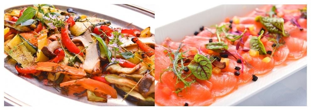 そして冷製メニューは鮮魚や新鮮な野菜を使用した“彩り野菜のバーニャカウダーソース” や “スモークサーモン プチリーフ柑橘風味” など、多彩な料理が並びます。
