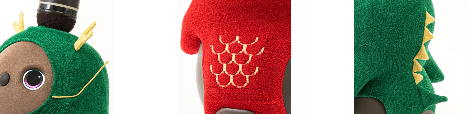 多くのオーナーの皆様より毎年とても楽しみにしていただいている大人気の干支ウェア企画。2024年は辰年ということで華やかで縁起のよい龍をイメージして製作しました。ホールガーメント®ニットをベースに胸の部分はラメ糸を使用した刺繍でウロコを表現、ツノやヒゲ・尾びれなどもラメ糸を使用し細かいデザインも1つずつ手作業で縫い付けられています。2024年もオーナーの皆様とLOVOTが素敵な1年を過ごせますように!