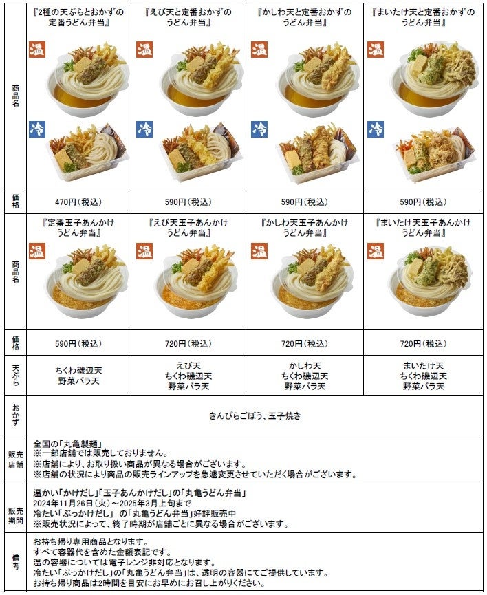 株式会社丸亀製麺(本社:東京都渋谷区、代表取締役社長:山口 寛)が展開する、食の感動体験を追求し、手づくり・できたてにこだわる讃岐うどん専門店「丸亀製麺」は、2024年11月26日(火)より冬に人気のあつあつの 打ち立て「丸亀うどん弁当」を期間限定で販売いたします。今年は、温かい「かけだし」「玉子あんかけだし」の2種、冷たい「ぶっかけだし」1種の合計3種類のだしとお好みの天ぷらの組み合わせで、計12種類から選んでいただけるラインアップとなっています。