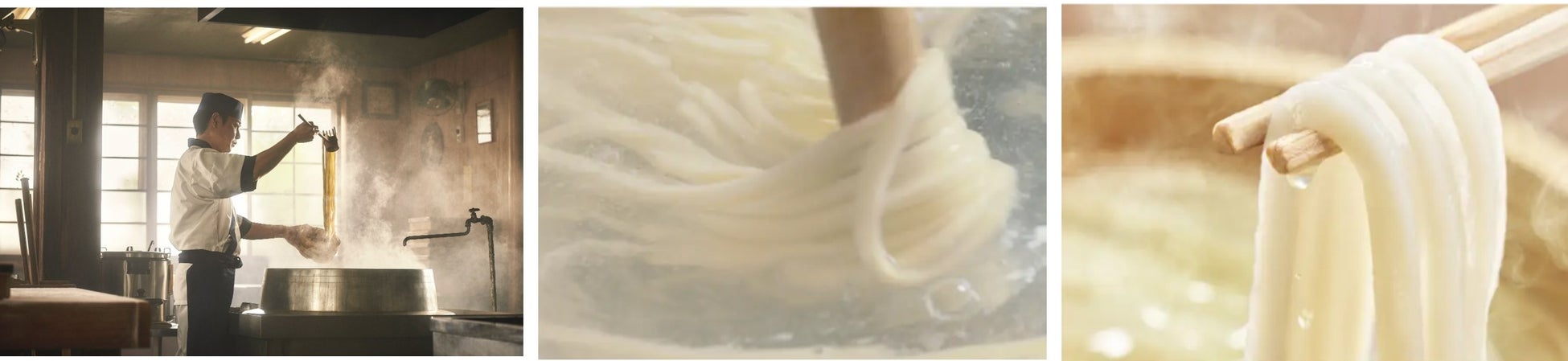 技と感性を磨いた「麺職人たち」が、100%国産の小麦粉を毎日打ち、その場で麺を切って、茹でて、つくりたてをお客さまに提供しているからこそ、独自のもちもちの食感とおいしさを守り続けることができているのです。