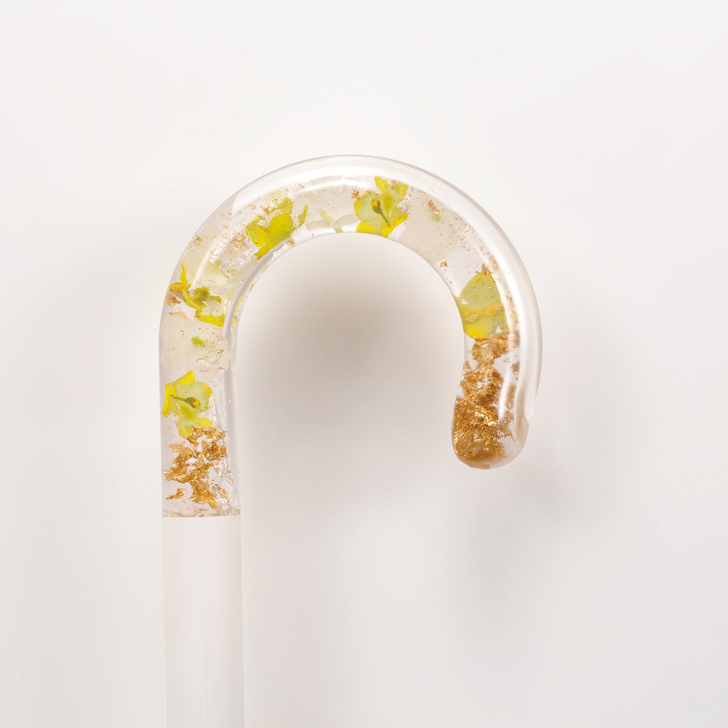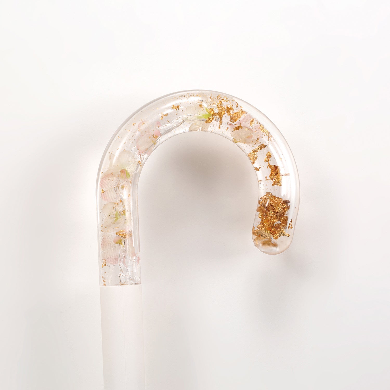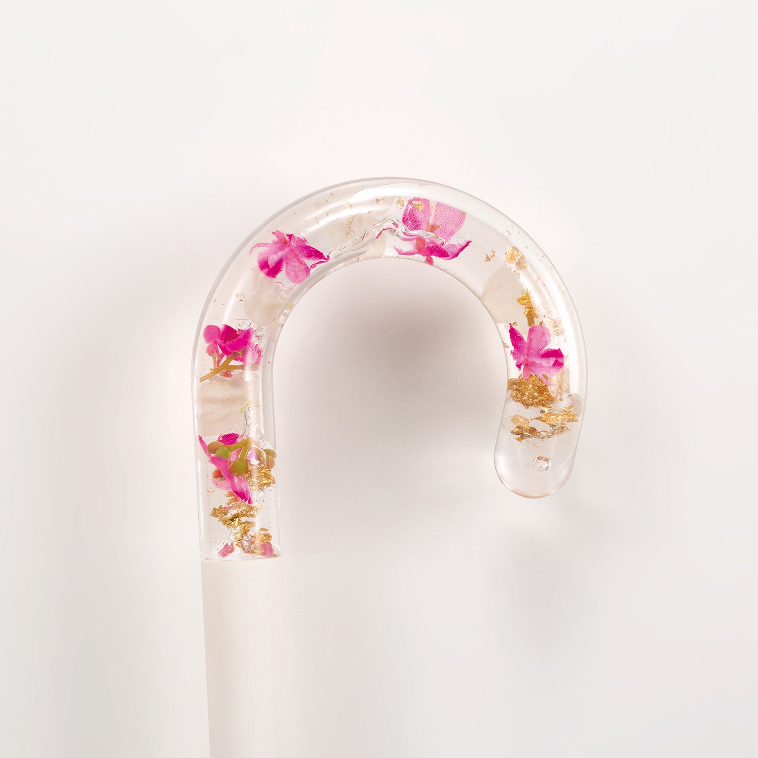 涼しげなクリアハンドルに鮮やかな花びら(造花)とゴールド色の箔を閉じ込めた「アクセサリーアンブレラ」は、ハンドルを手首にかけると、まるでお花のバングルを付けているかのよう!アクセサリー感覚で楽しんでいただけるビニール傘です。